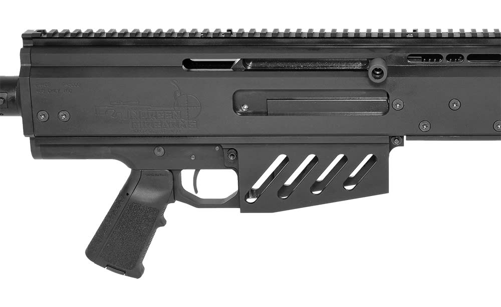 Effective to 2500 meters, this .408 Cheytac Noreen BN408 is a piston driven, side-charging, semi-automatic rifle which features a black nitride 28" barrel with 1:13" twist, adjustable AR15 collapsible stock, A2 pistol grip, 10 round magazine, match trigger, bipod, Noreen muzzle brake, nickel boron coating internal finish, and a black oxide external finish.