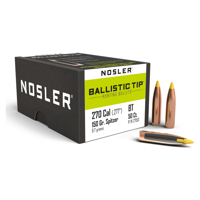 The Nosler Ballistic Tip 150-grain Soft Point (SP) bullet in .270 caliber delivers rapid expansion and high energy transfer, making it perfect for medium to large game. Its polymer tip enhances aerodynamics and initiates controlled expansion on impact.
