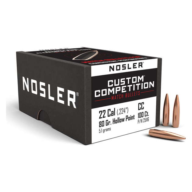 These 22 caliber 80-grain Custom Competition bullets feature a hollow point boat tail design for match-grade accuracy. Built for long-range shooting, they deliver consistent performance and tight groupings. A top-tier choice for competitive reloaders.