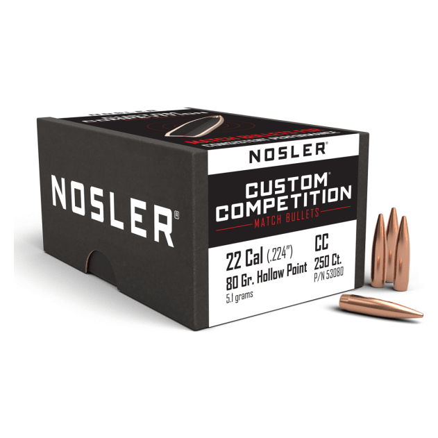 The Nosler Custom Competition 80-grain HPBT bullet in .22 caliber is optimized for high-precision shooting at extended ranges. Its boat tail design and uniform construction deliver consistent accuracy. Available in 250-count boxes with no minimum purchase.
