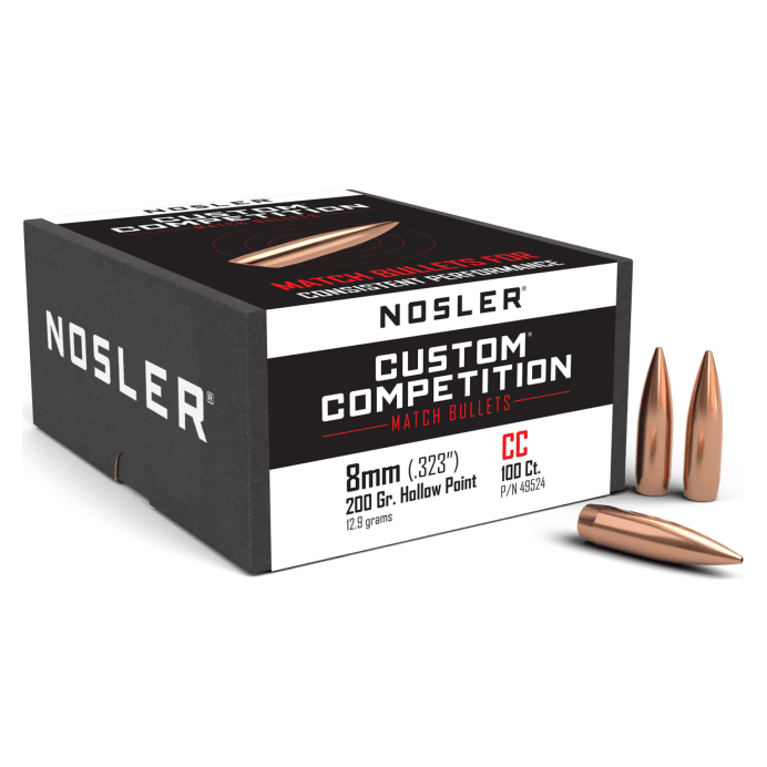 These 8mm 200-grain Custom Competition bullets feature a hollow point boat tail design for match-grade accuracy. They deliver consistent performance and tight groupings. Ideal for precision reloaders and competitive shooters.