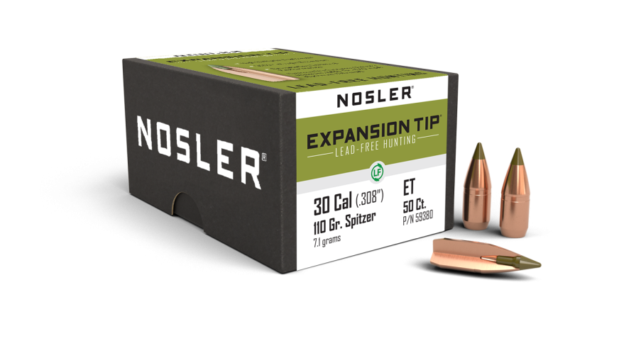 The Nosler E-Tip 110-grain Soft Point bullet in .30 caliber features a lead-free design for eco-conscious hunters. Its monolithic construction and polymer tip ensure deep penetration and high weight retention.