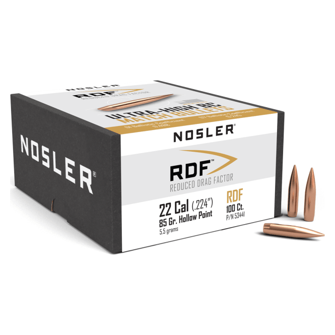 The Nosler RDF 85-grain HPBT bullet in .22 caliber offers exceptional long-range accuracy with a high ballistic coefficient and minimal drag. Its consistent construction ensures tight groupings and reliable performance.