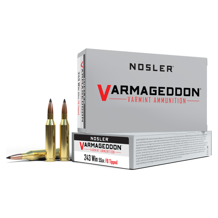 This 243 Win Varmageddon round uses a 55-grain flat base tipped bullet for explosive varmint control. It delivers high velocity and rapid fragmentation for maximum terminal effect. Perfect for small game and predator hunting with precision.