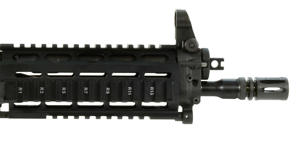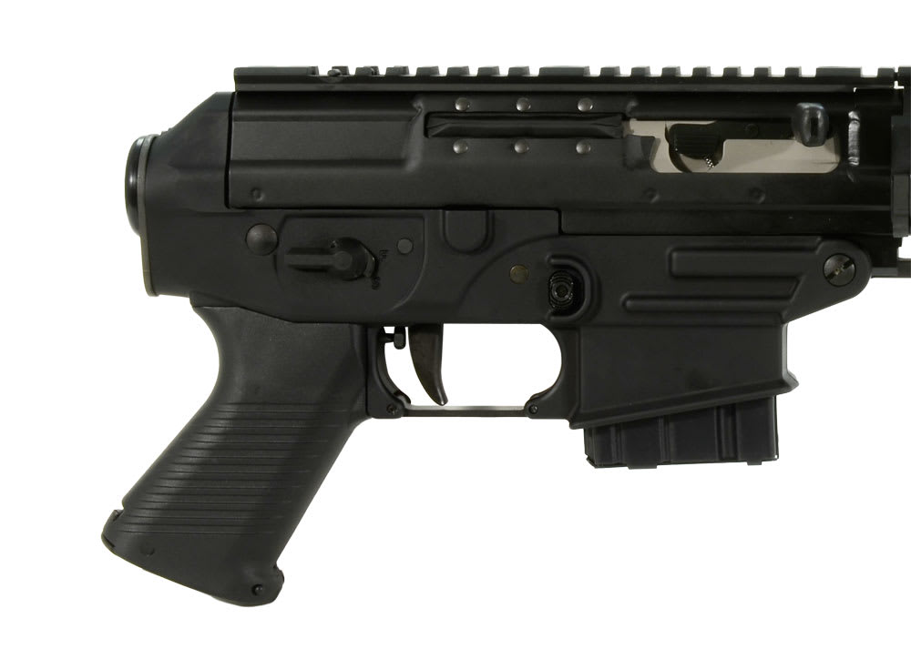 P556® SWAT features a 10" button rifled barrel, chambered in 5.56mm NATO, with a twist rate of 1 in 7". The flash suppressor uses a standard .5 x 28 TPI thread pattern, ensuring compatibility with after-market accessories. The optional flip up front combat sight is adjustable for windage, rear for elevation. The receiver is made of high strength steel with a durable wear-resistant Nitron® finish. The Picatinny rail features a SIG SAUER® Mini Red Dot sight that works in concert with the optional hooded front sight. The trigger housing is machined from an aircraft grade aluminum alloy forging with a hard-coat anodized finish designed to survive extreme conditions. The P556 SWAT features a aircraft aluminum quad-rail designed for mounting accessories. The P556 SWAT comes equipped with a smooth two-stage trigger, ambidextrous safety and is designed to accept standard AR magazines.