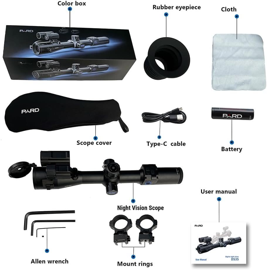 The DS35-70RF-850 is a digital night vision scope that features a 2560x1440 PARD VLEA sensor and a 2.9μm pixel pitch. It is sensitive down to .001 lux and has a 70mm focal length. The base optical magnification is 5.6x and is backed up with a 2x digital zoom. The soft silicone eye cup provides 100m of eye relief and safety from recoil. The DS35-70RF-850 also features an 850nm IR illuminator that is effective out to 500yds. The IPS LCD display is a true 800x800 circular display that provides a viewing experience much like a traditional optical scope. There are 6 reticle styles, 3 reticle colors and 4 colors modes included to make customization easy based on your personal preferences. The DS35-50RF-850 captures 2560x1440 .JPG photo images and 1920x1080 .mp4 video that can be saved to a 128GB removable micro SD card. Additional features include PIP mode, Laser Range Finder, Ballistics Calculator, gyroscope, self-activated recording WIFI connectivity to Android or iOS mobile devices through the free PardVision app, rechargeable/removable Li-Ion 18650 battery, IP67 weatherproof rating to protect against dust and moisture, 6000j recoil resistance and aluminum chassis. The DS35-70RF-850 weighs in at only 680g for lightweight portability and performance.
