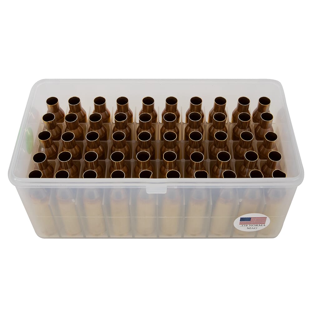 Box of 50 Peterson .338 Norma Mag unprimed brass cases. Used, like new, 2 necks dented, plastic case cracked