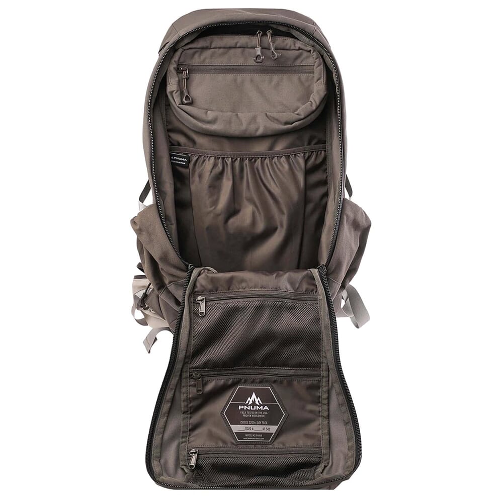 Named after the scenic mountain range of Texas, the Chisos Day Pack by Pnuma Outdoors is the perfect companion for your next hunt, hike, or adventure into the backcountry. It features a sizable interior of 2200 cubic inches and a rugged construction of Cordura 560D Tactical Nylon. The exterior is given a polyurethane waterproof coating and features YKK AquaGaurd Water Repellent zippers to keep your essentials out of the elements. To keep your gear organized, the Chisos features a full length zippered spotting scope pocket, 3 zippered organization pockets inside the front flap, stretchable side pockets for storing water bottles and other accessories, and a removable 9” x 5” molle pouch which can be attached to the waist belt for use and a standalone Lumbar pack. To evenly distribute the load, the Chisos pack features adjustable shoulder straps, an adjustable sternum strap, and load lifter straps. These straps feature heavy padding and a no-slip silicone print.