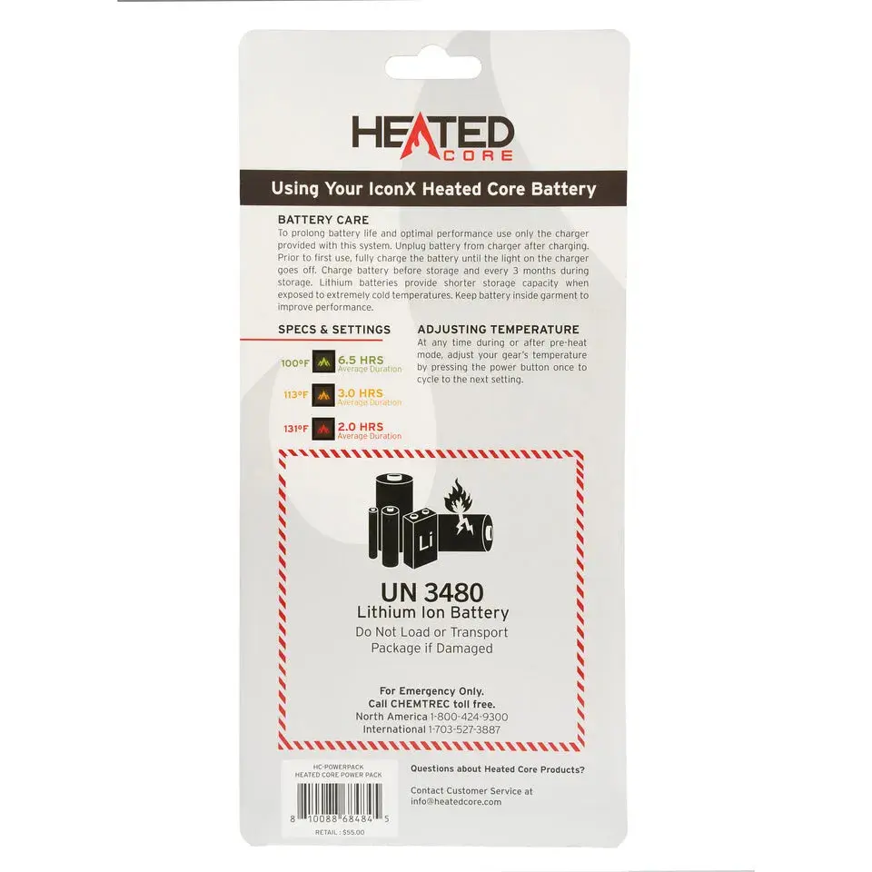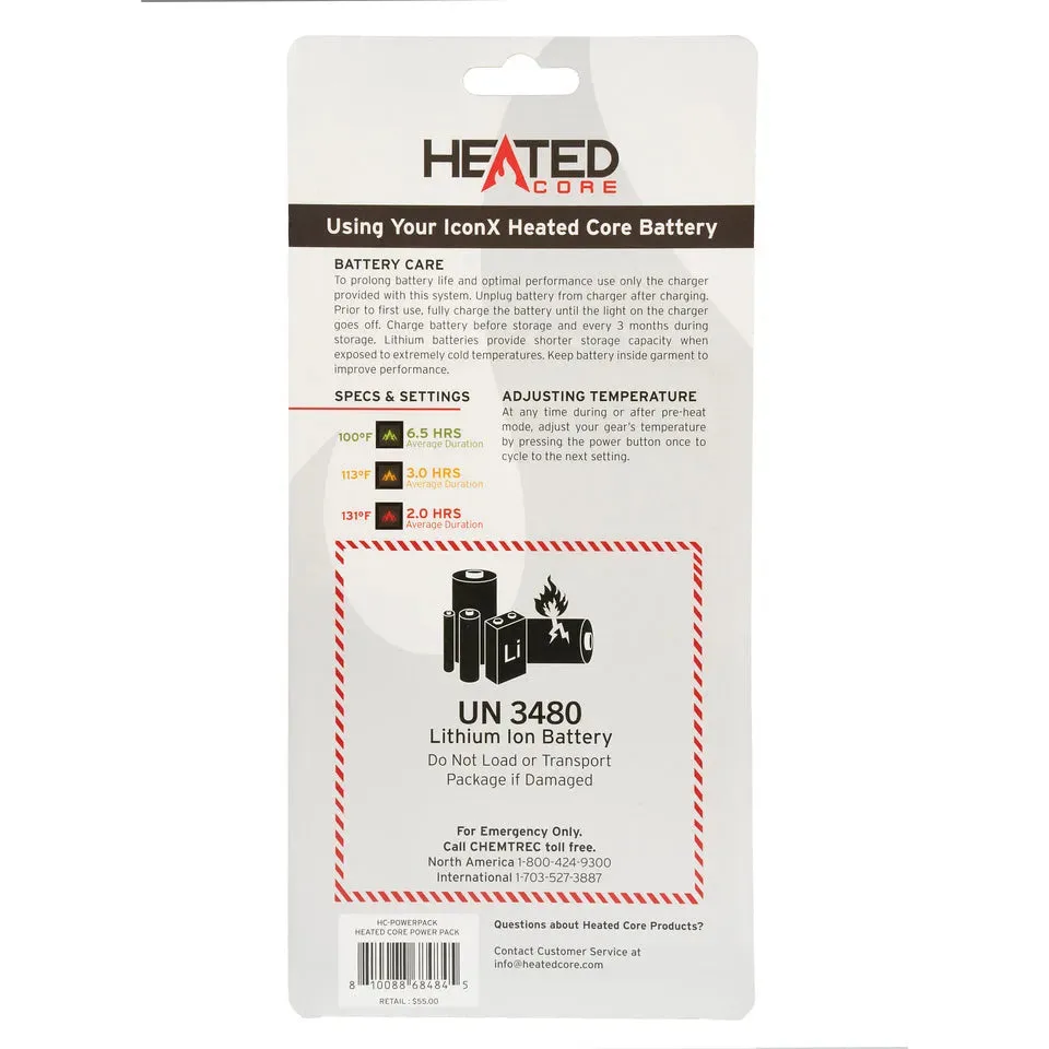 Stay warm longer with an extra battery for the Heated Core Hand Warmer IconX Heated Core Vest IconX Heated Core Long Sleeve Shirt and the IconX Heated Core PantRe-chargeable 7.4V Lithium-ion batteryApproximately 6.5 hours of battery performance at Low setting, 3 hours on the medium setting, and 2 hours on High setting – individual performance may vary depending on heat level selection and usageUSB output can be used to charge your mobile deviceBattery & Charger includedNote: Pnuma does not guarantee 3rd party Battery and/or Charger for life. Battery and/or Charger guaranteed against defects in performance for 1 year from date of purchase. Battery life will vary by heat level selection and usage.