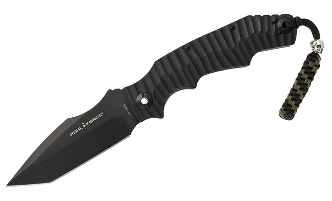 This non-serrated Pohl Force Alpha Four knife boasts a piercing Spearpoint blade, pocket clip, great handling with gloves, and a paracord lanyard with metal skull and 3D rubber patch.