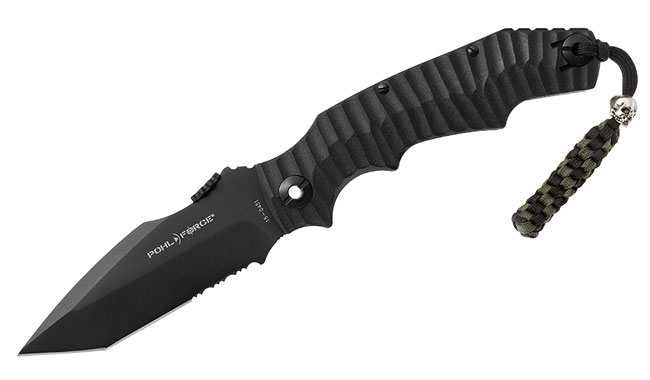 This serrated Pohl Force Alpha Four knife boasts a piercing Spearpoint blade, pocket clip, great handling with gloves, and a paracord lanyard with metal skull and 3D rubber patch.