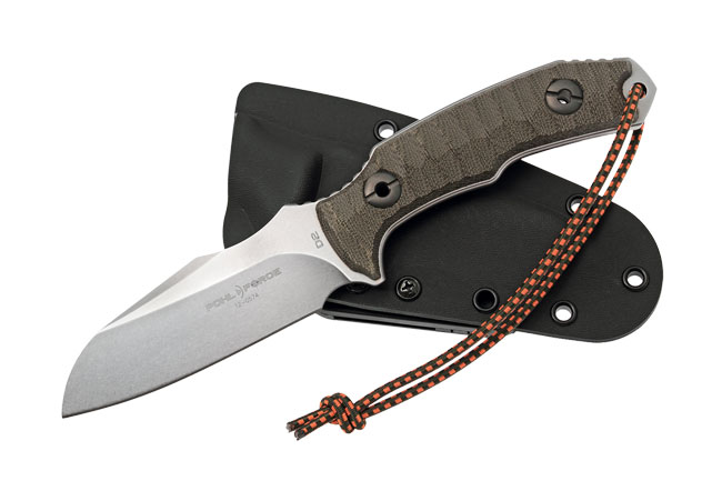 The modified Santoku blade measures five millimeters almost to the tip, and provides a dependable tool for you at all times. The full-tang extends to the end of the handle, which therefore can also be used as a striking tool. For a comfortable grip, you can choose a handle made of coarse textured Canvas Micarta® or G-10 fiberglass.