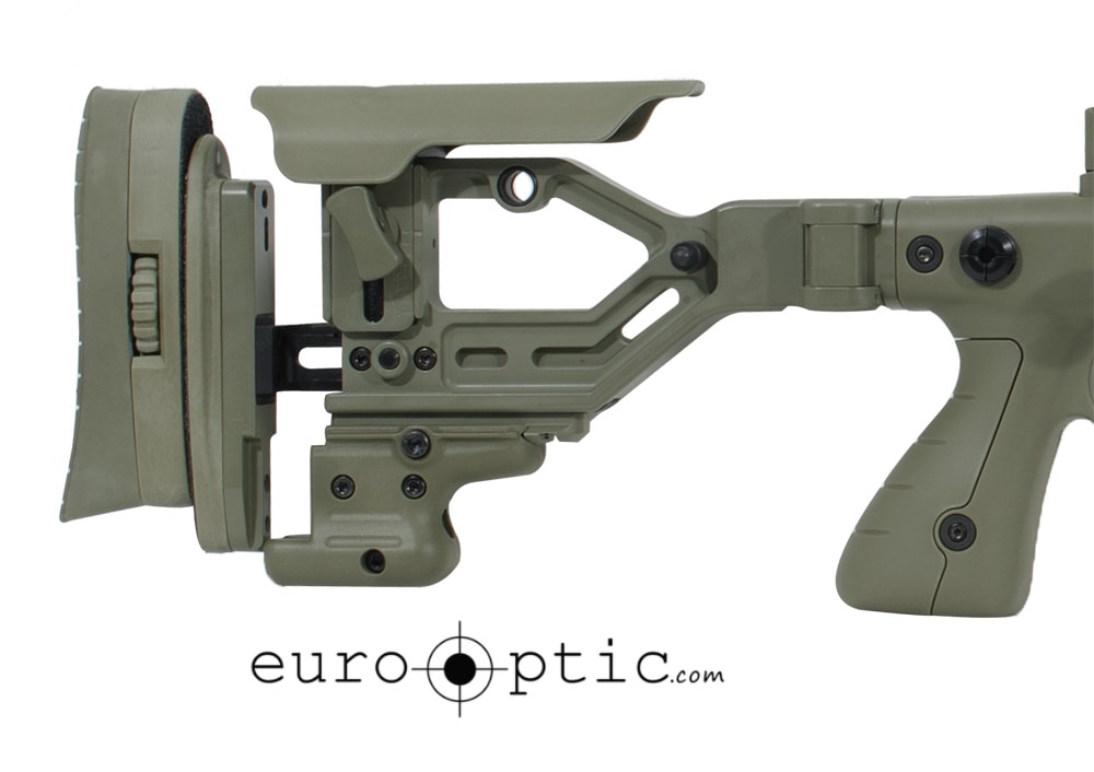 - Cheekpiece is configurable for lateral and height adjustments, and also stores a 4mm hex wrench for rifle disassembly.