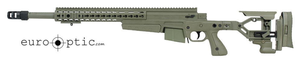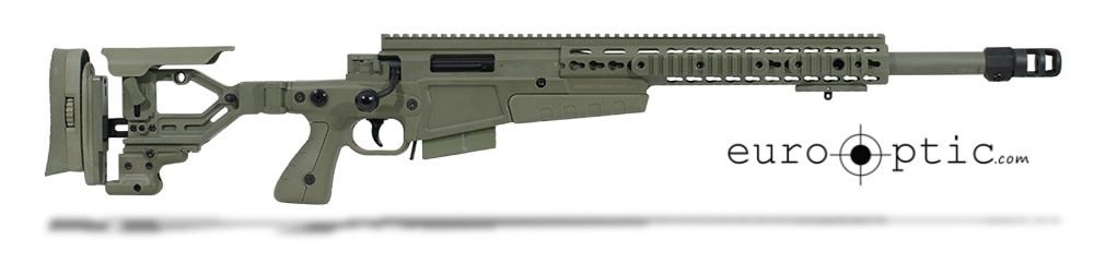 This version of the Accuracy International AXMC is a .308 Winchester with a 20" threaded green barrel with muzzle brake and features a green stock.