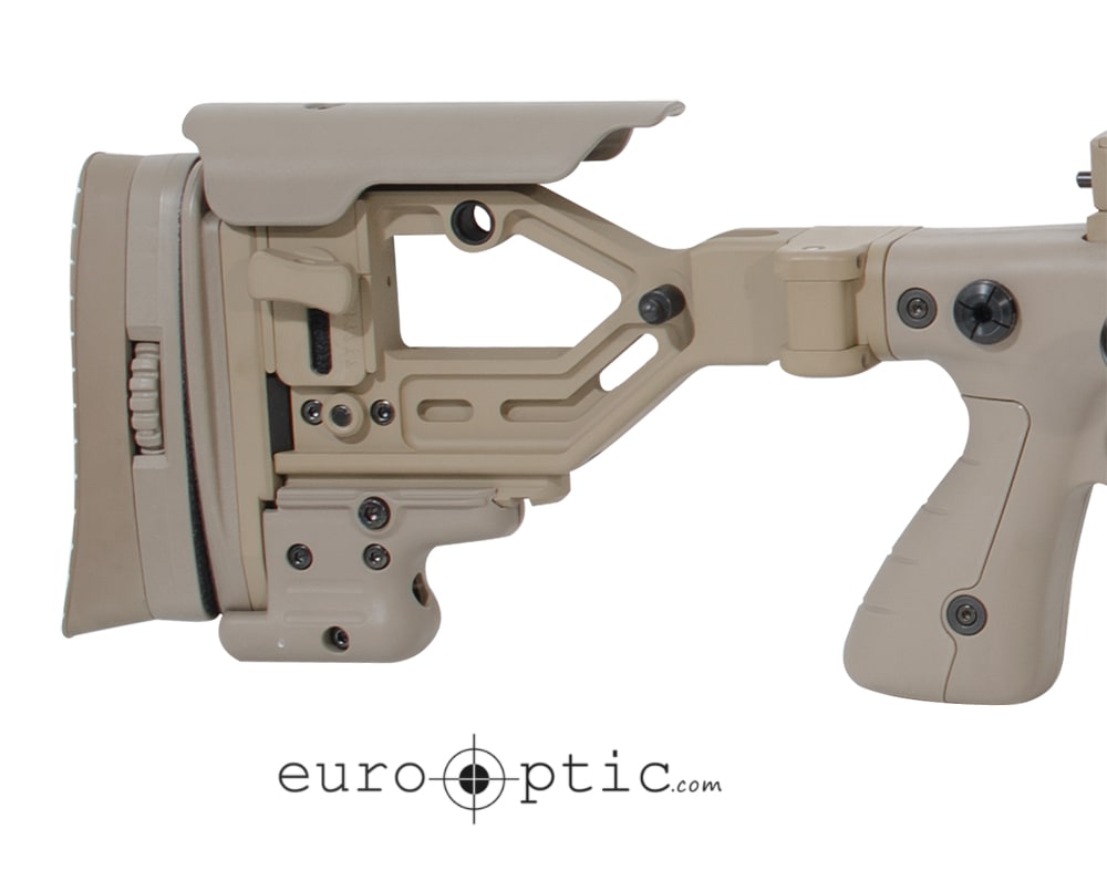 - Cheekpiece is configurable for lateral and height adjustments, and also stores a 4mm hex wrench for rifle disassembly.