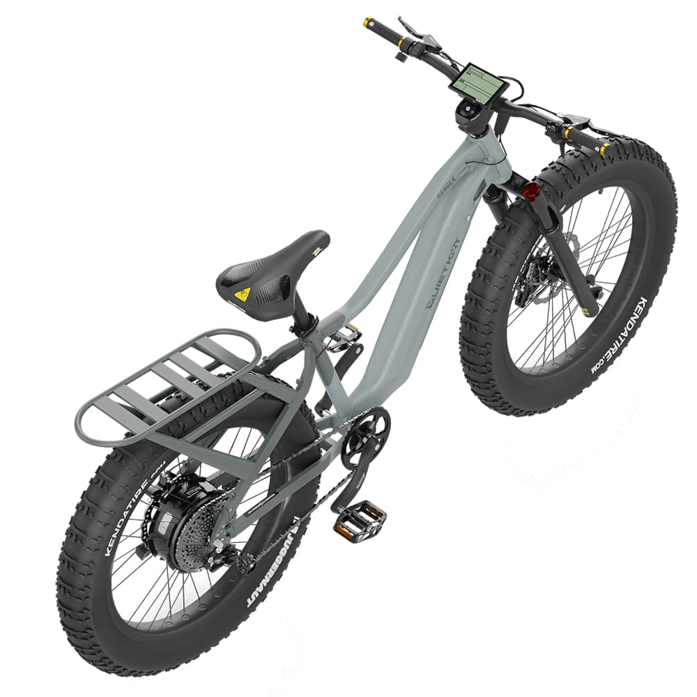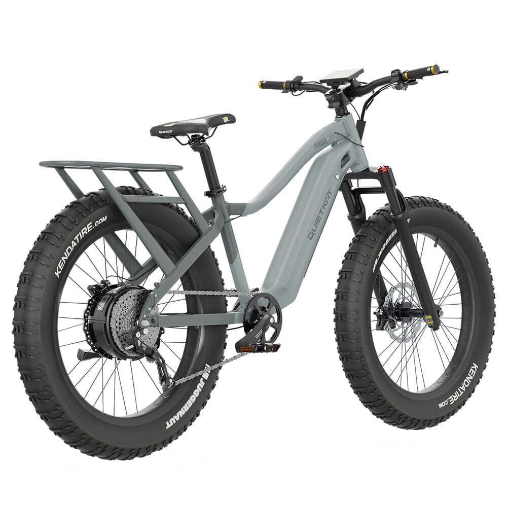 QuietKat’s Ranger eBike was built from the ground up for backcountry adventures. It comes equipped with a 1000w hub-drive motor that delivers direct power to the rear wheel independent from the chain for consistent power in all gears. The motor can be set to 5 levels of pedal assist, allowing the Ranger to easily overcome moderate inclines, haul heavy gear, and power through unforgiving landscapes. Alternatively, the Ranger can be set to the throttle mode to power the bike without pedaling – this mode can also be used to keep going even if the chain breaks – and a walk assist mode to make pushing the bike while dismounted easier. The Ranger is powered by a 16Ah battery that gives the bike a range of 24 to 48 miles*, but this can be upgraded to a 17.25Ah battery for additional range and power. Both versions of the battery can be charged anywhere via the included wall charger or by a mobile charger (sold separately) or a solar charger (sold separately). The powerful motor is perfectly complemented by the heavy duty all-terrain 26" x 4.5" fat tires. These provide optimal stability as well as superior traction in adverse terrain such as soft sand, snow, mud, dirt, and rocky environments. Other features of the Ranger include an built-in cargo rack to accommodate all your gear, from hunting equipment to work supplies and features an industry-leading 100 lbs hauling capacity. In addition, a set of Tektro two-piston hydraulic disc brakes with large 203mm rotors guarantee reliable braking on steep descents with heavy loads.