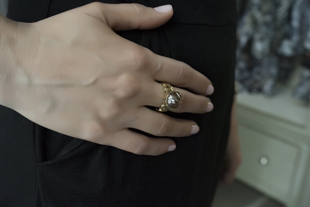 This 18K ring is one of those pieces that can and will turn heads around. This ring is anything but small. The size, the shapes, cuts, colors, and materials all contribute to an exquisite, show-stopping piece. Gold is, like everyone already knows, the epitome of luxury, wealth, and power. It’s been a symbol of glamour for centuries now and combined with a magnificent 7.07CT Rustic Diamond as its center stone, 4 colored diamonds, and 12 white ones, it gives the piece a dazzling, magnetic, and most of all, bold appearance!