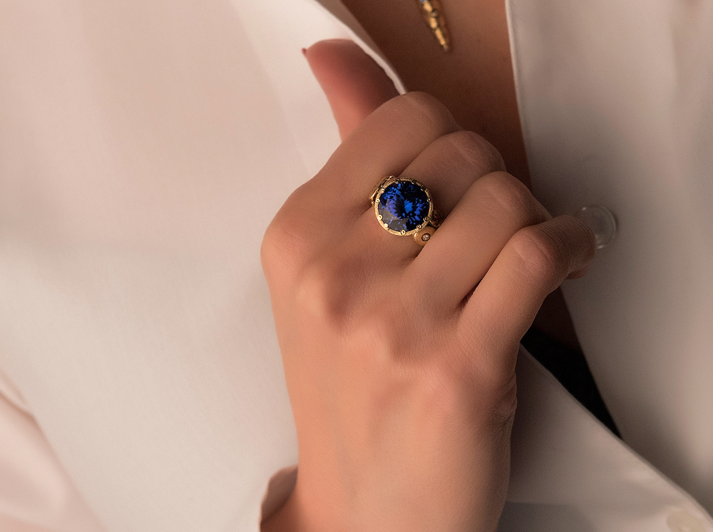 To find a piece of Tanzanite that is of this size and quality is quite a rare thing – and Alex Sepkus has made the most of this. Tanzanite can appear blue, violet, or burgundy depending on the viewing angle.