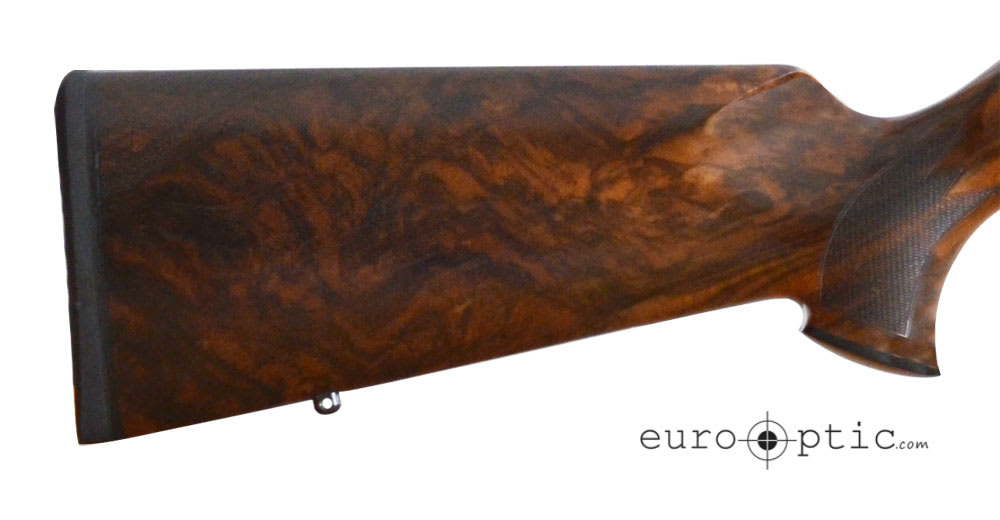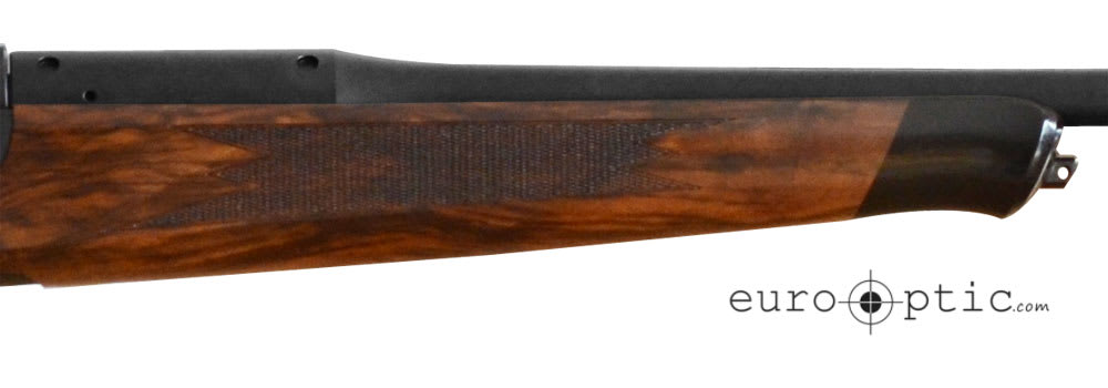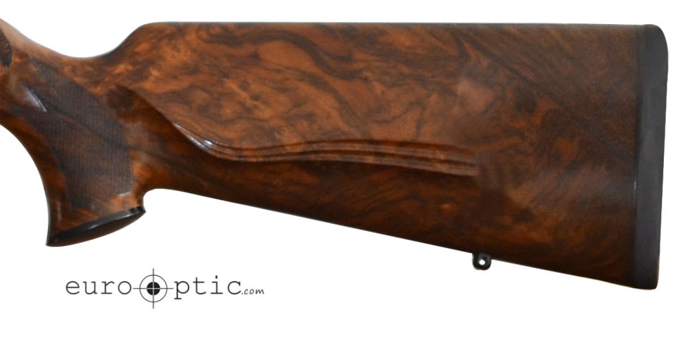 Typically available with a grade 3 wood stock, this .30-06 Blaser R8 rifle features a grade 9 wood upgrade for no additional charge. That's a $2500 SAVINGS! This R8 Jaeger also includes a black receiver, Bavarian check piece, double rabbet, rubber recoil pad, and black synthetic forearm tip. Exact firearm is shown in picture. Serial #RR027051.
