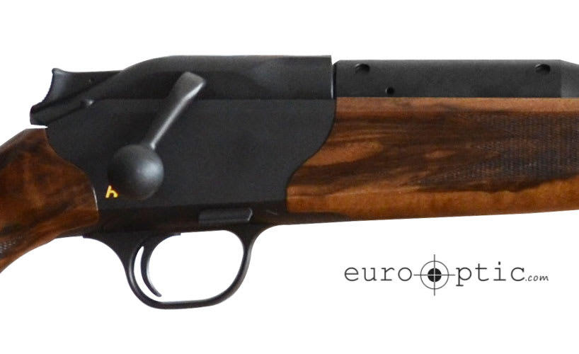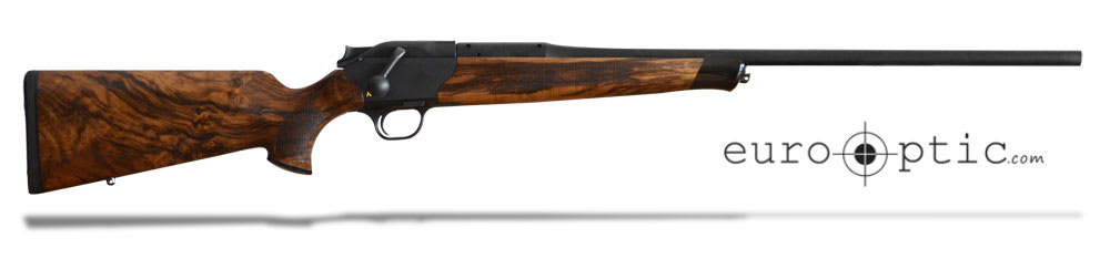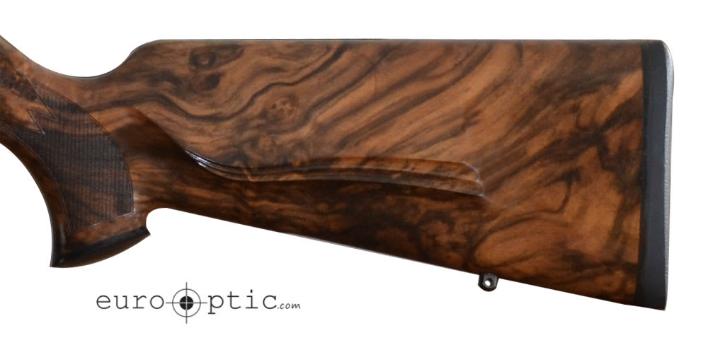 Typically available with a grade 3 wood stock, this .375 H&H Blaser R8 rifle features a grade 9 wood upgrade for no additional charge. That's a $2500 SAVINGS! This R8 Jaeger also includes a black receiver, Bavarian check piece, double rabbet, rubber recoil pad, and black synthetic forearm tip. Exact firearm is shown in picture. Serial #RR027052.