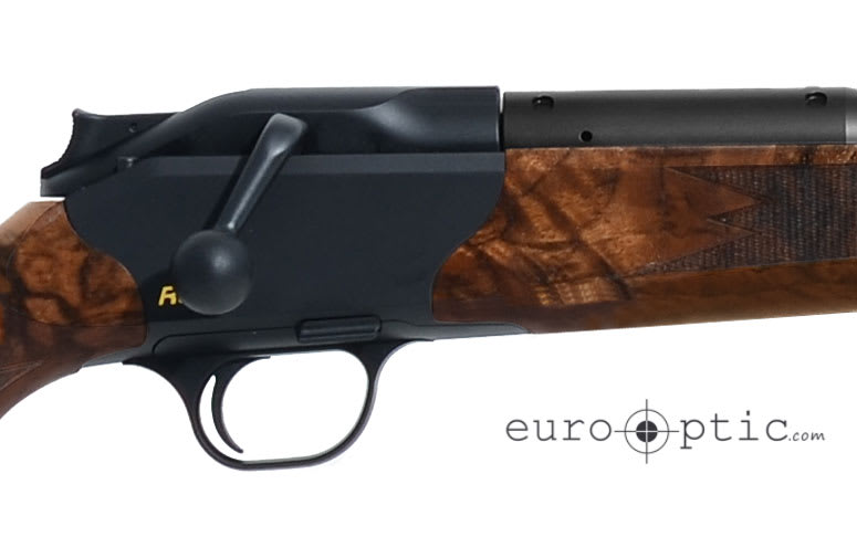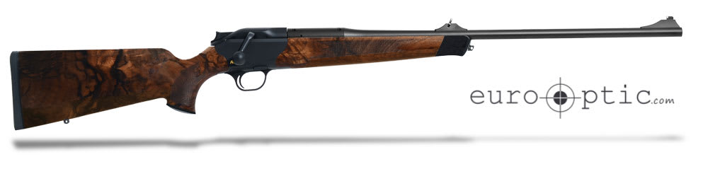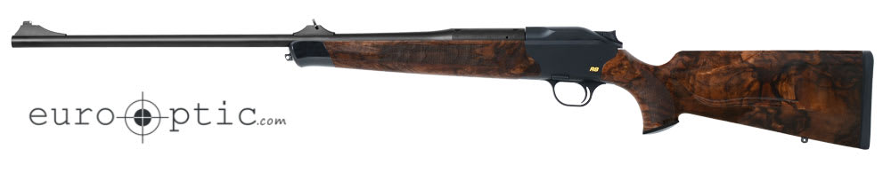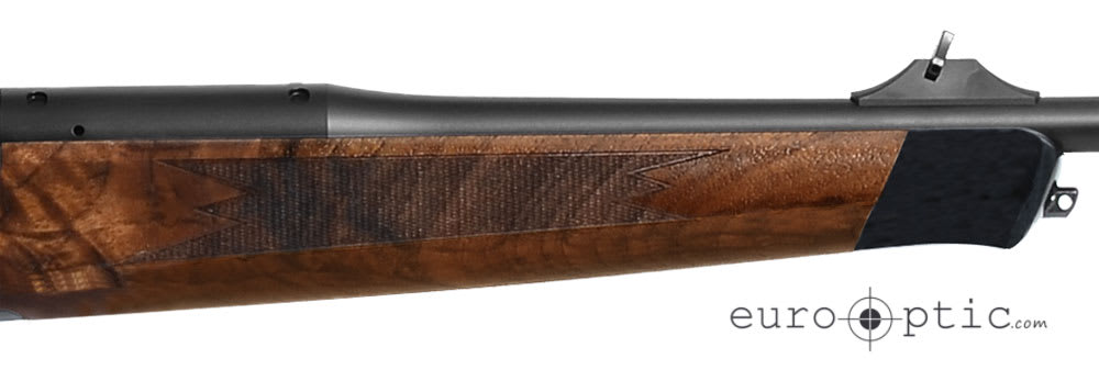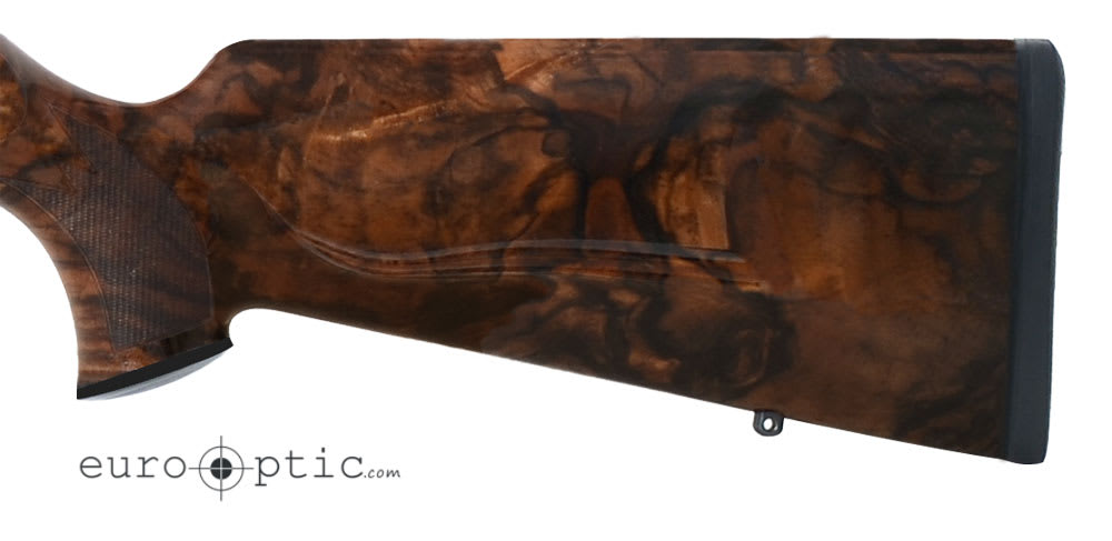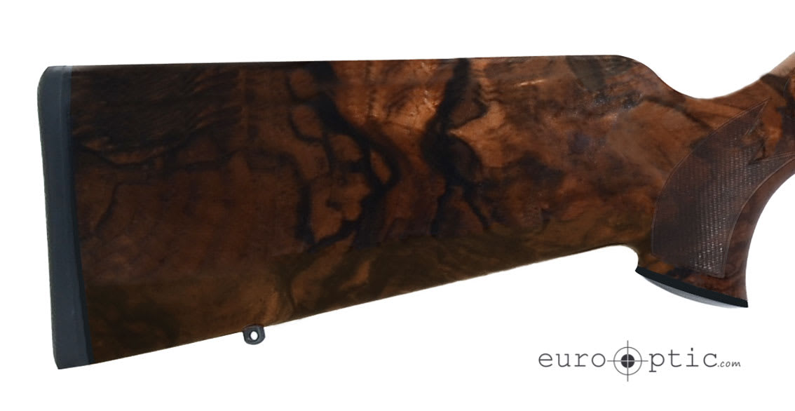 Typically available with a grade 3 wood stock, this .375 H&H Blaser R8 rifle features a grade 9 wood upgrade for no additional charge. That's a $2500 SAVINGS! This R8 Jaeger also includes a black receiver, Bavarian check piece, double rabbet, rubber recoil pad, and black synthetic forearm tip. Exact firearm is shown in picture. Serial #RR027055.