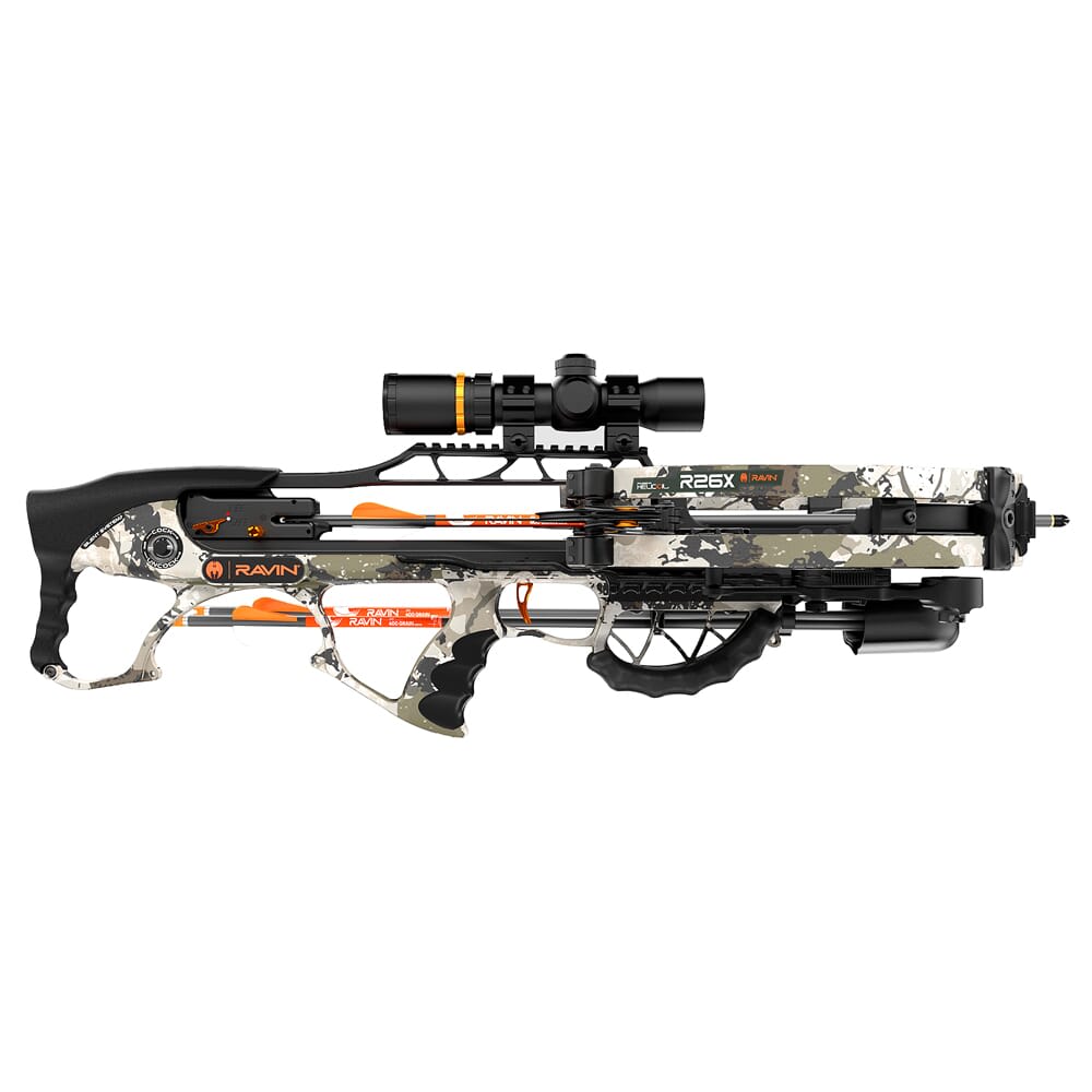 Ravin brings its renowned R26 crossbow to the next level with the R26X! It comes with all of the familiar features of the R26, but adds a serious upgrade – a fully-integrated silent cocking system. This feature gives hard-core hunters a whisper quiet draw every time. As with the previous model, the R26X gets its name from an ultra-short length of just 26 inches. Despite its compact size, the R26X is still able to send bolts downrange at a ripping 400 feet per second. This high velocity is made possible thanks to Ravin’s exclusive HeliCoil Technology. This proprietary design coils the cables away from the top and bottom of the cams in helical grooves to keep them perfectly balanced. This allows the cams to rotate 340 degrees, resulting in outstanding velocity and rifle-like accuracy. In addition, the R26X comes fully assembled and pre-tuned, and ships with a 100 yard illuminated scope, a quiver/mounting bracket, a removable draw handle, and 3 bolts.