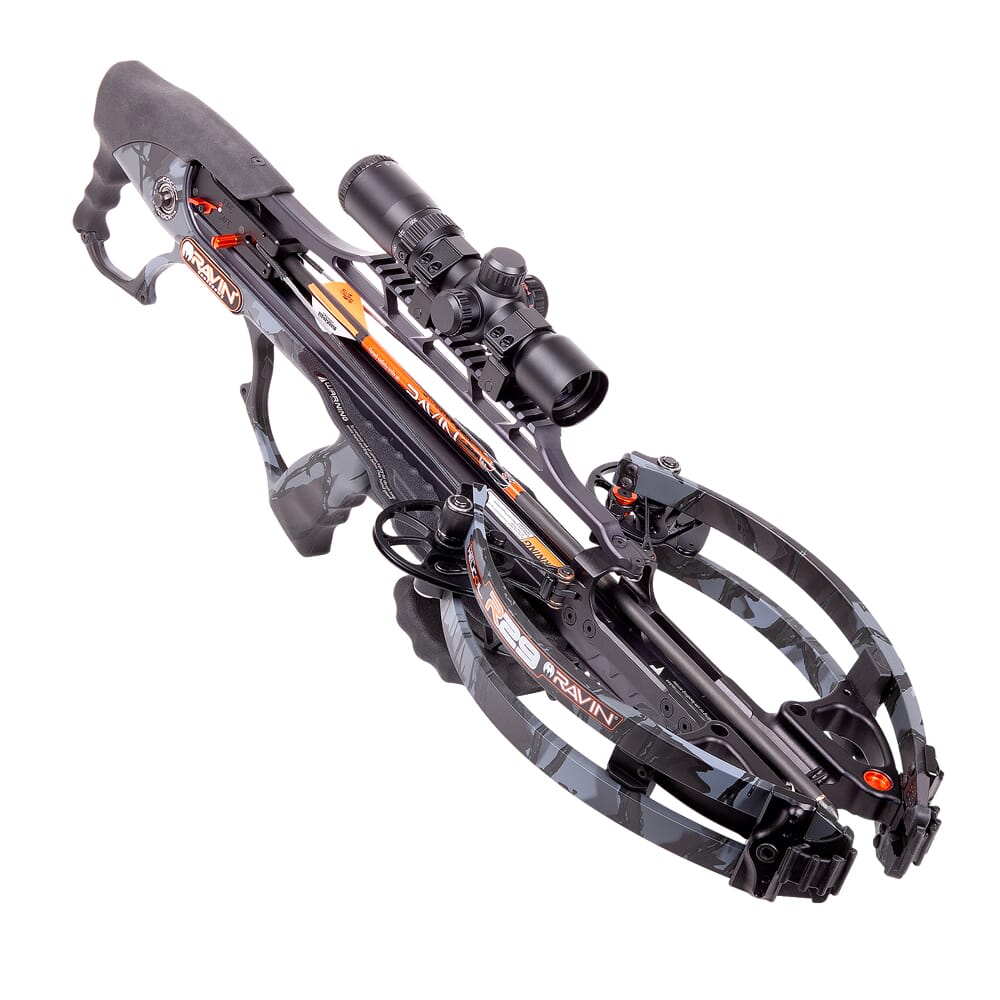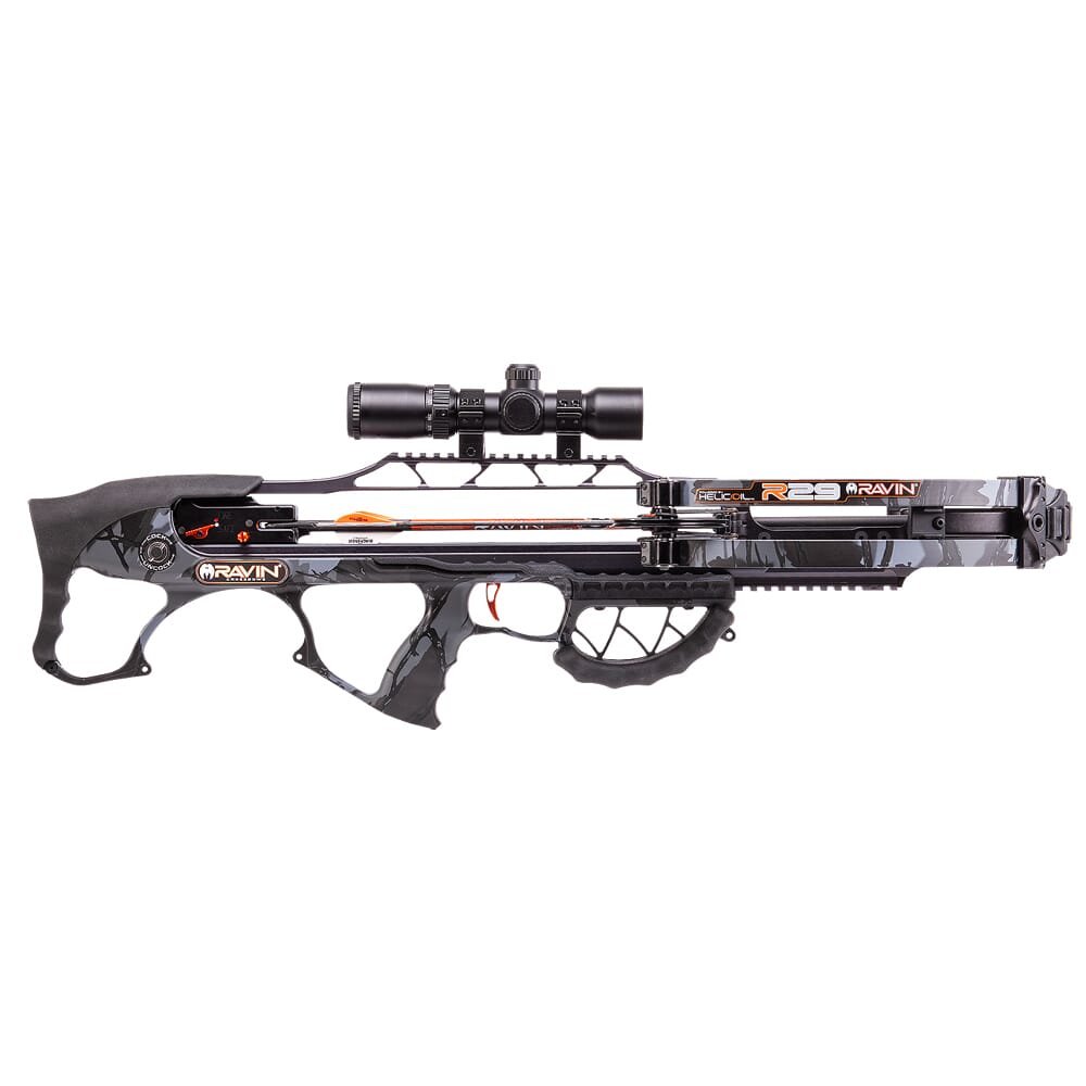 The new Ravin R29 crossbow is an incredible 5.5 inches shorter than the R20 and still delivers arrows at 430 FPS with a punishing 164-foot pounds of kinetic energy. Featuring a 12.5 inches power stroke, the Ravin R29 measures 29 inches in length and weighs 6.75 pounds. The Ravin R29 maintains its sleek design with an incredible axle-to-axle with of a mere 6 inches when fully-drawn. As with all Ravins this crossbow comes fully assembled and pre-tuned so that you can practice your aim straight out of the box without wasting any time with complicated assembly or tuning. To protect you and the quality of your weapon, this Ravin R29 Crossbow features anti-dry fire and auto safety mechanisms. For ease of comfort you can also use the built-in sling mounts to attach a Ravin Backpack or Shoulder sling. So get your hands on the most compact crossbow to date in the new Predator Dusk Camo pattern, exclusive to Ravin Crossbows.