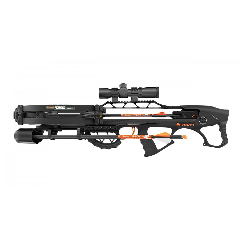 The Ravin R29X crossbow now incorporates a silent cocking system capable of pushing arrows up to 450 fps and producing 180 ft. lbs. of kinetic energy. With a 12.5 inch power stroke, the Ravin R29X measures 29 inches in length and weighs 6.75 pounds. The Ravin R29X maintains its sleek design with an incredible axle-to-axle with of a mere 6 inches when fully-drawn. As with all Ravins this crossbow comes fully assembled and pre-tuned so that you can practice your aim straight out of the box without wasting any time with complicated assembly or tuning. To protect you and the quality of your weapon, this Ravin R29X Crossbow features anti-dry fire and auto safety mechanisms. For ease of comfort you can also use the built-in sling mounts to attach a Ravin Backpack or Shoulder sling. So get your hands on the most compact crossbow to date in the new Predator Dusk Camo pattern, exclusive to Ravin Crossbows.