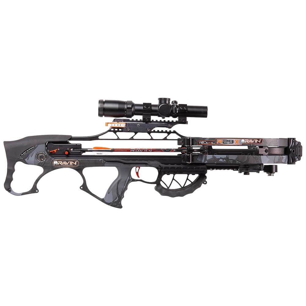 Ravin’s new R29X Sniper Package includes everything you need for top of the line speed and deadly downrange accuracy. The R29X Sniper Package shoots 3-inch groups at 100 yards with 450 FPS and is ideal for those looking for a fast and hard hitting crossbow. The R29X Sniper Package is complete with the new fully integrated Silent Cocking System, HeliCoil Technology and comes with a tactical crossbow scope mounted to a jack plate adjustable elevation mount that you can adjust anywhere between 20 and 200 yards with a simple turn of the dial. Also included as part of the Sniper Package is a scope level and .001 premium arrows for shooting perfection. Available in Predator Dusk Camo, exclusive to Ravin Crossbows.