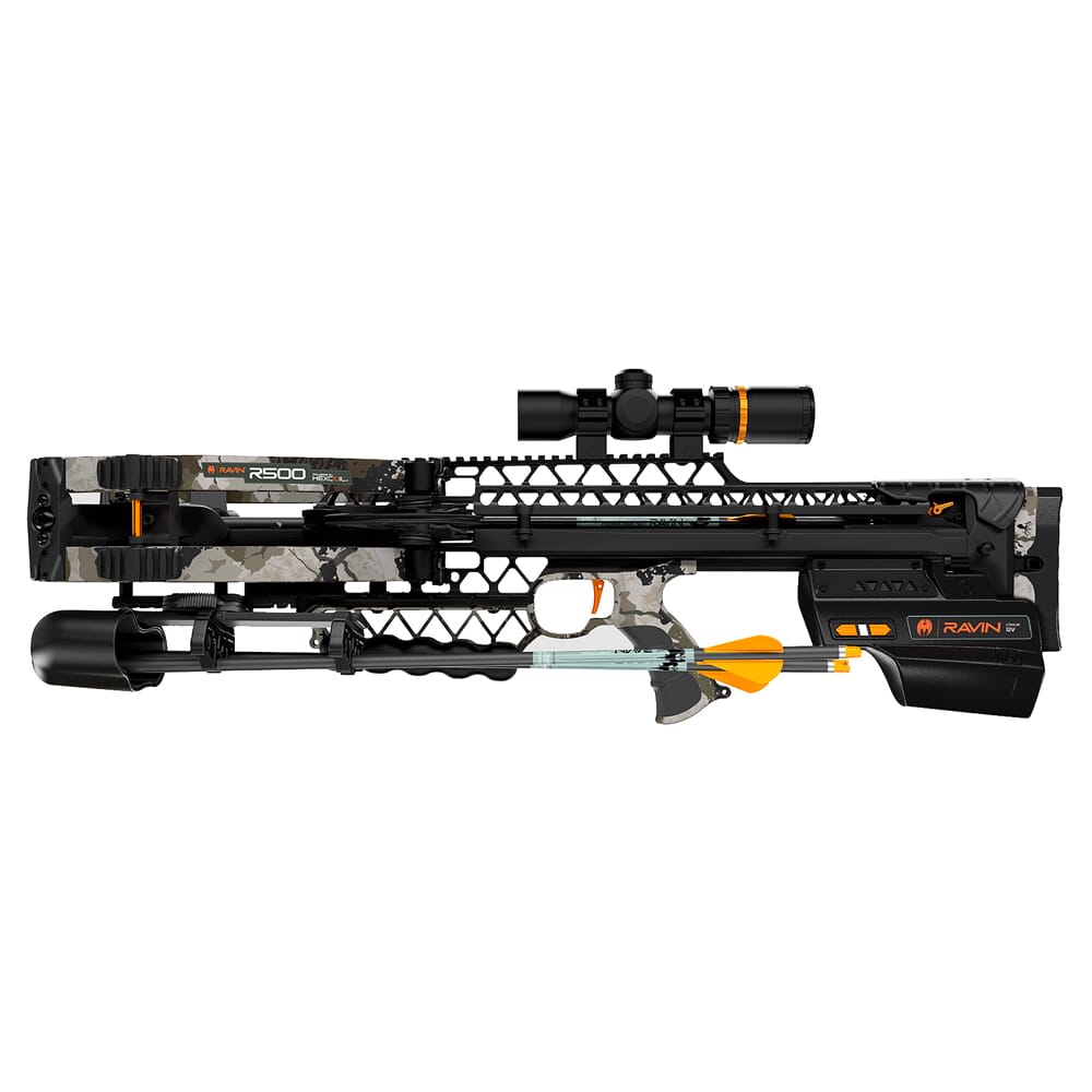 Ravin’s R500E Slate Gray Crossbow Sniper Package was designed for discerning shooters who demand extreme accuracy. This advanced crossbow is equipped with Ravin’s Electric Drive System which can cock and un-cock mechanism with the press of a button. This automatic cocking device attaches directly to the stock and consists of a motor and 12-volt rechargeable battery. Alternatively, the R500E can be manually cocked with the included R500 draw handle. The Sniper Package also features the Adjustable Turret Scope which allows the user to fine-tune their yardage by turning the elevation turret, and a Ravin Scope Level that improves accuracy by indicating whether or not the crossbow is perfectly level. In addition, the R500E is designed with Ravin’s proprietary HexCoil Cam System, which can launch a 400 grain arrow at 500 feet per second with an axle-to-axle width of 3.6 inches when cocked and 7.6 inches un-cocked. The crossbow also features the VersaDrive Cocking system, which is composed of a dual-screw drive that moves the Trac Trigger Firing System back and forth. The VersaDrive’s integrated clutch removes any chance of over-cocking and enables the cocking/de-cocking process to be stopped at any time.