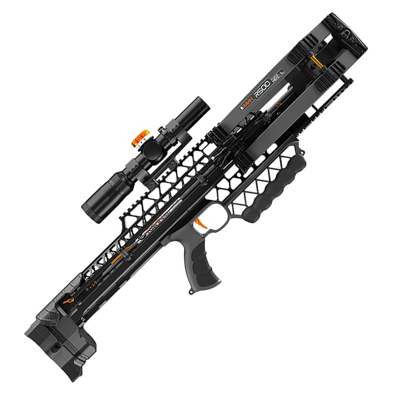 Ravin’s R500 Slate Gray Crossbow Sniper Package was designed for discerning shooters who demand extreme accuracy. It comes with Ravin’s proprietary HexCoil Cam System, which can launch a 400 grain arrow at 500 feet per second with an axle-to-axle width of 3.6 inches when cocked and 7.6 inches un-cocked. This crossbow also features the VersaDrive Cocking system, which is composed of a dual-screw drive that moves the Trac Trigger Firing System back and forth. The VersaDrive’s integrated clutch removes any chance of over-cocking and enables the cocking/de-cocking process to be stopped at any time. In addition, the R500 Sniper Package features the Adjustable Turret Scope which allows the user to fine-tune their yardage by turning the elevation turret, and a Ravin Scope Level that improves accuracy by indicating whether or not the crossbow is perfectly level.