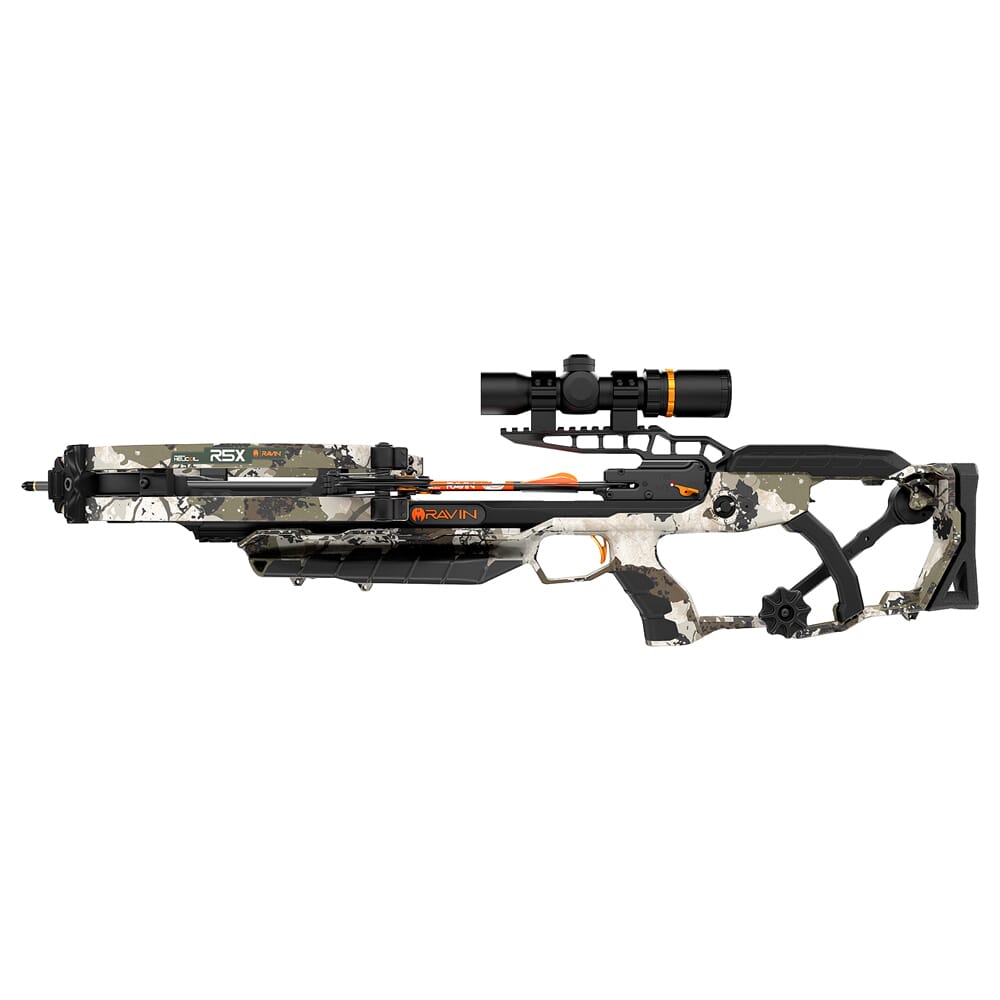 The Ravin R5X combines the traditional crossbow configuration with a next generation bullpup design to create an ultra-compact, high-performance crossbow. It comes standard with Ravin’s exclusive HeliCoil Technology. This proprietary design coils the cables away from the top and bottom of the cams in helical grooves to keep them perfectly balanced. This allows the cams to rotate 340 degrees, resulting in outstanding velocity and rifle-like accuracy. For better ergonomics and shooter comfort, the RX5 is equipped with a fully adjustable stock that can be finely tuned for cheek height and length of pull. Other features of the RX5 include a silent cocking system in the stock as well as an anti-dry fire/automatic safety system. In addition, the RX5 ships with an accessory package that includes a 100 yard illuminated scope, a removable draw handle, 3 bolts, and a quiver/mounting bracket.