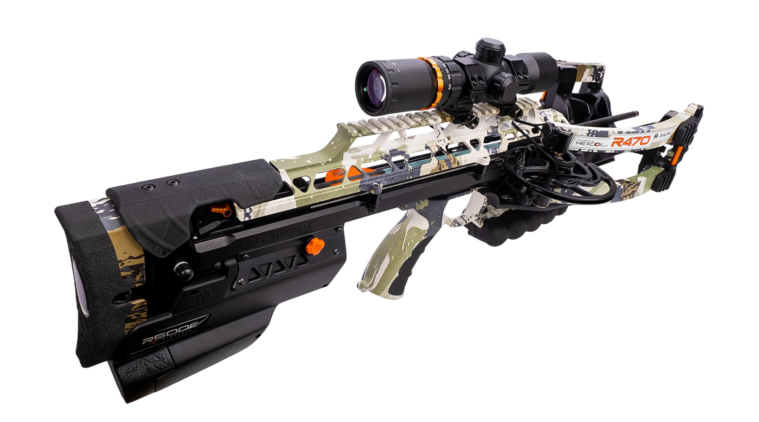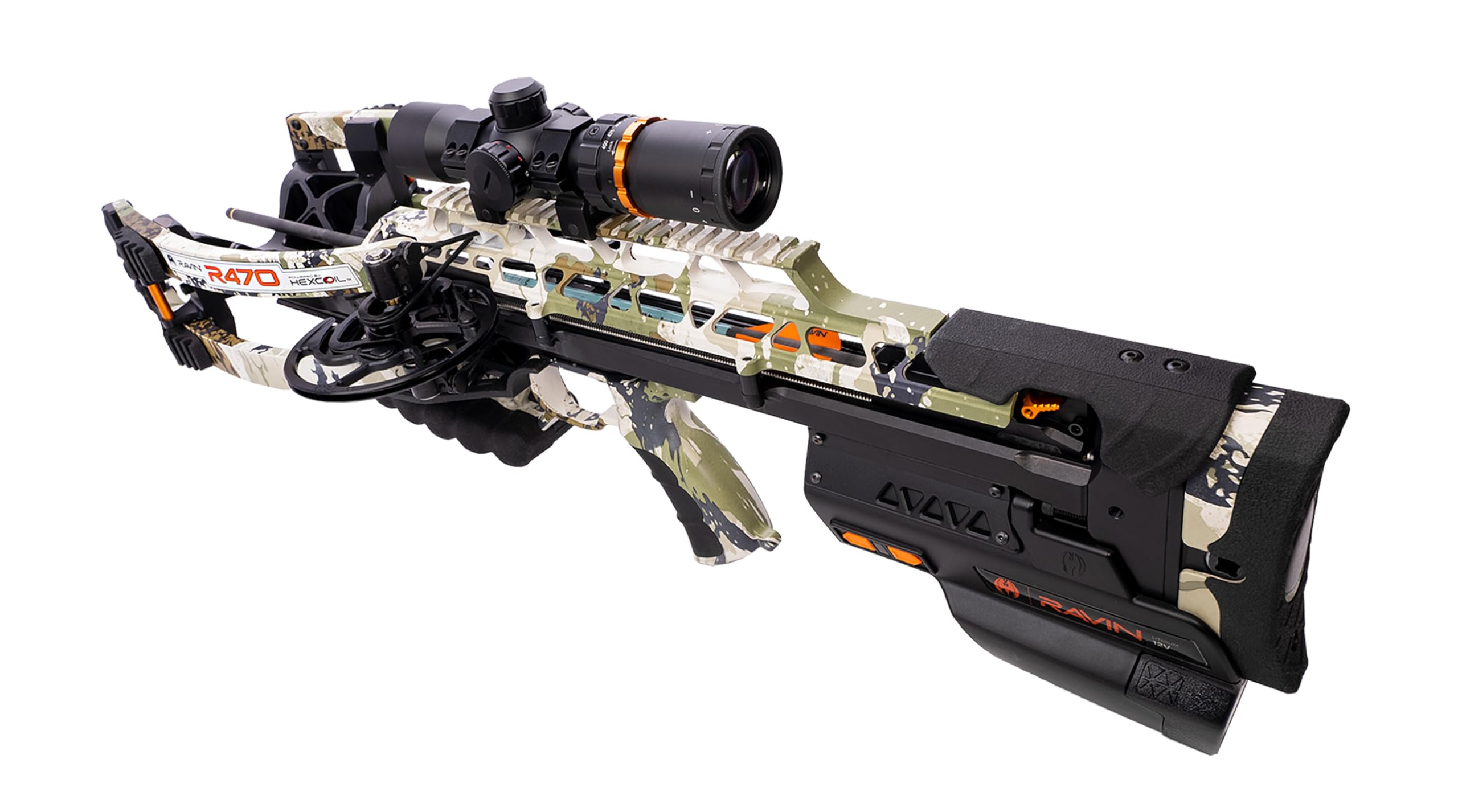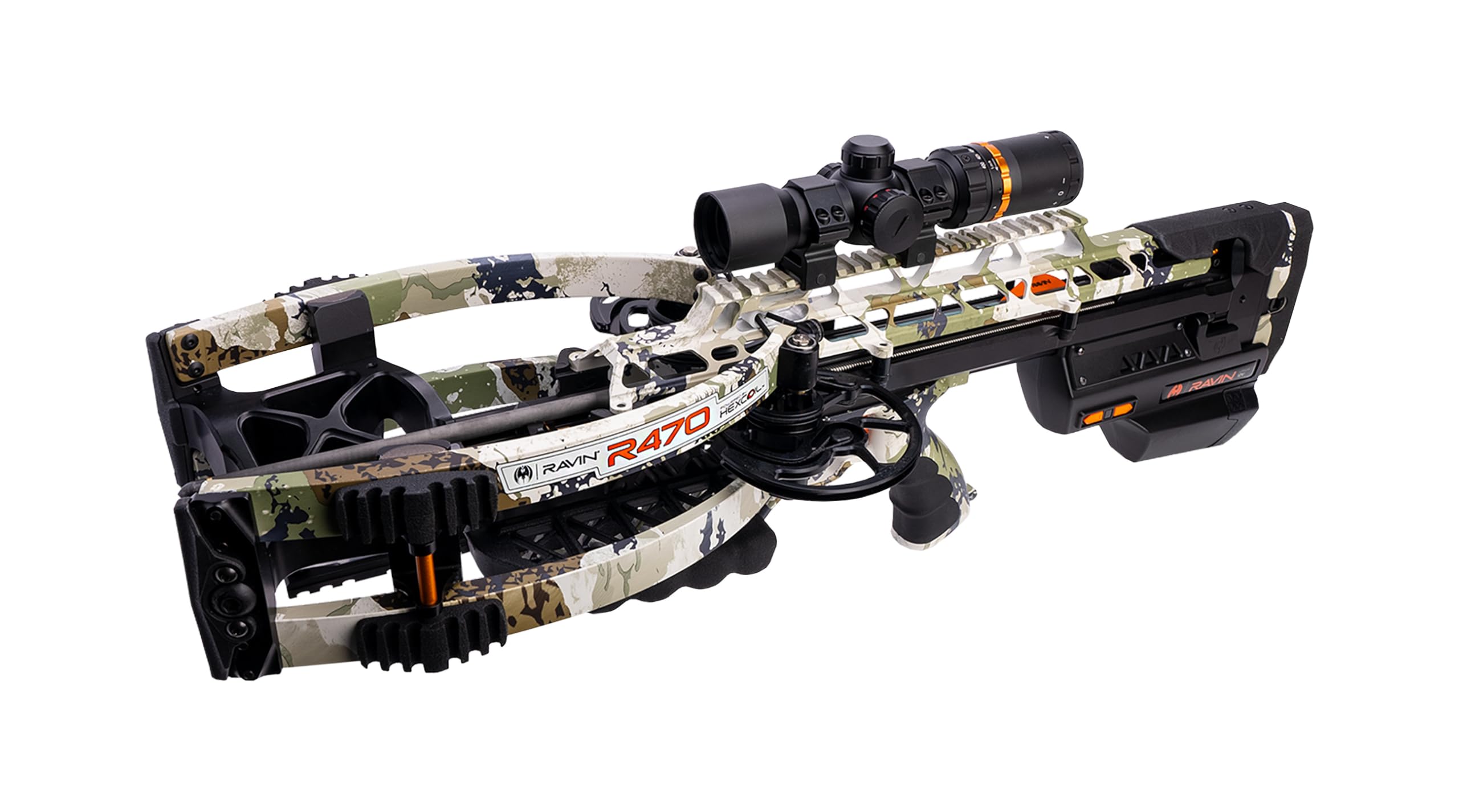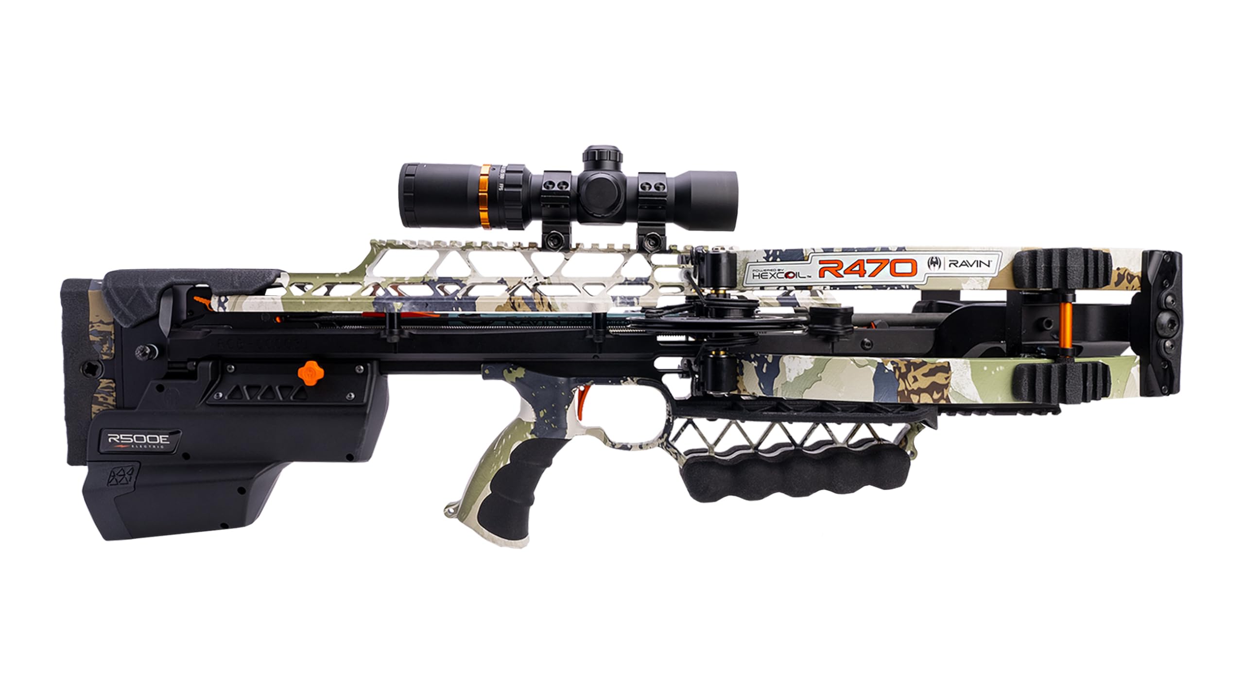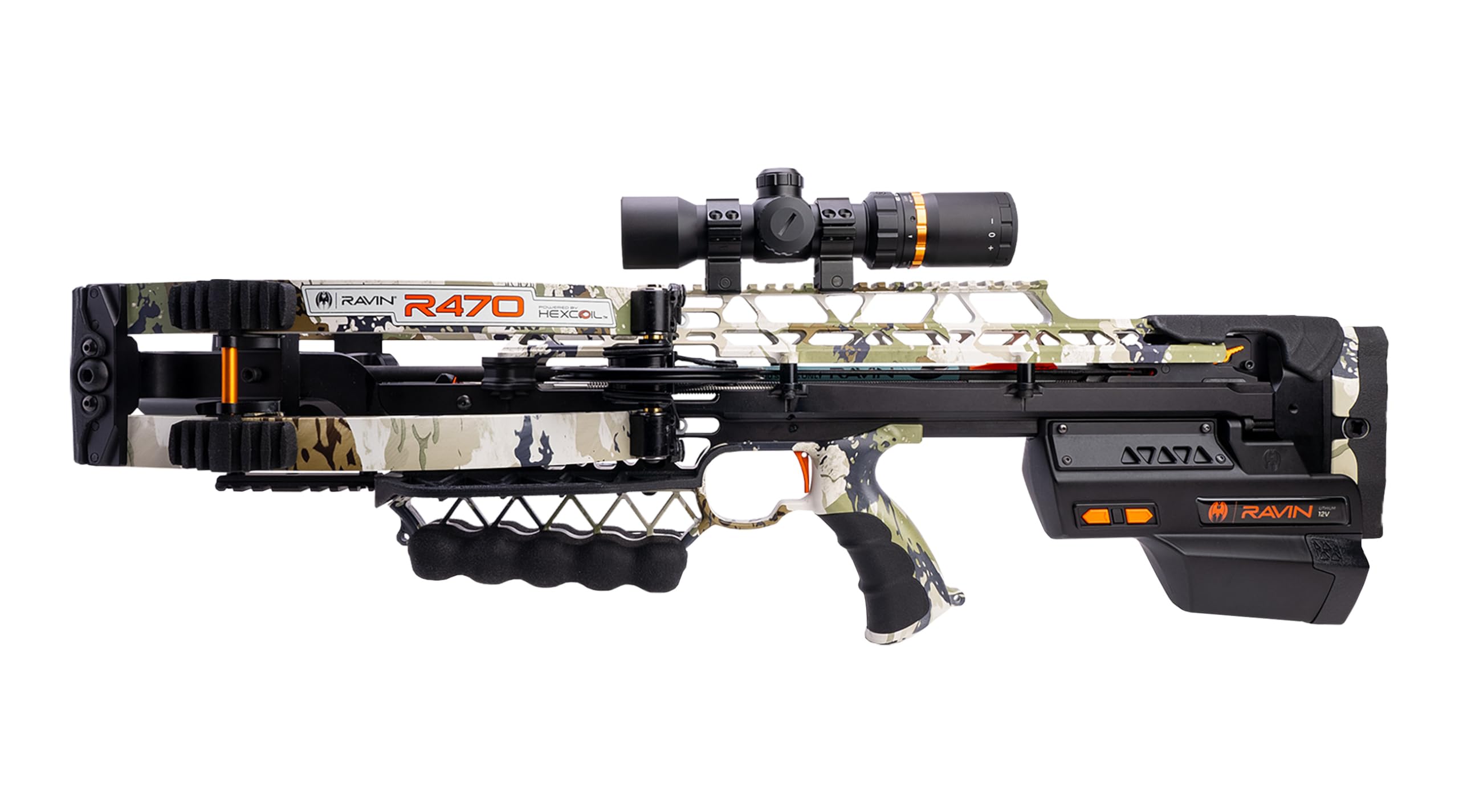 The Ravin Ravin 470E XK7 Camo Crossbow R064 is a high-performance crossbow equipped with the Ravin Electric Drive System, allowing for effortless cocking and de-cocking with the push of a button. Shooting at 470 FPS with 196 foot-pounds of kinetic energy, this crossbow features the advanced HexCoil Cam System for unparalleled accuracy and efficiency. The durable platform increases string and cable life, while the silent operation ensures a smooth hunting experience. The 470E comes in KINGS XK7 Camo and includes a 100-yard illuminated scope, arrows, field points, and a quiver