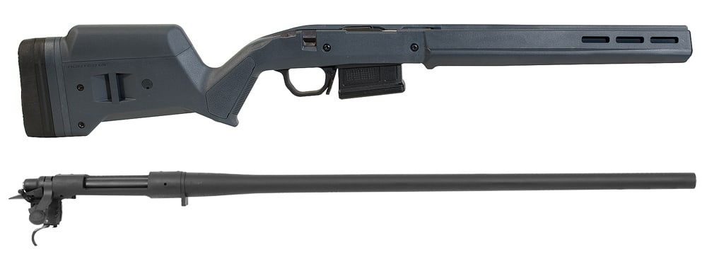 This Remington 700 Police barreled action is chambered in .300 Winchester Magnum and comes with a Grey Magpul Hunter 700 Long Action Stock, Magpul Detachable Mag Bottom Metal (DBM), and a 5 round Magpul Magazine. The Magpul chassis brings an ergonomic and functional benefit as well as providing a stable, rugged platform for the Remington 700 Police barreled action to shine.