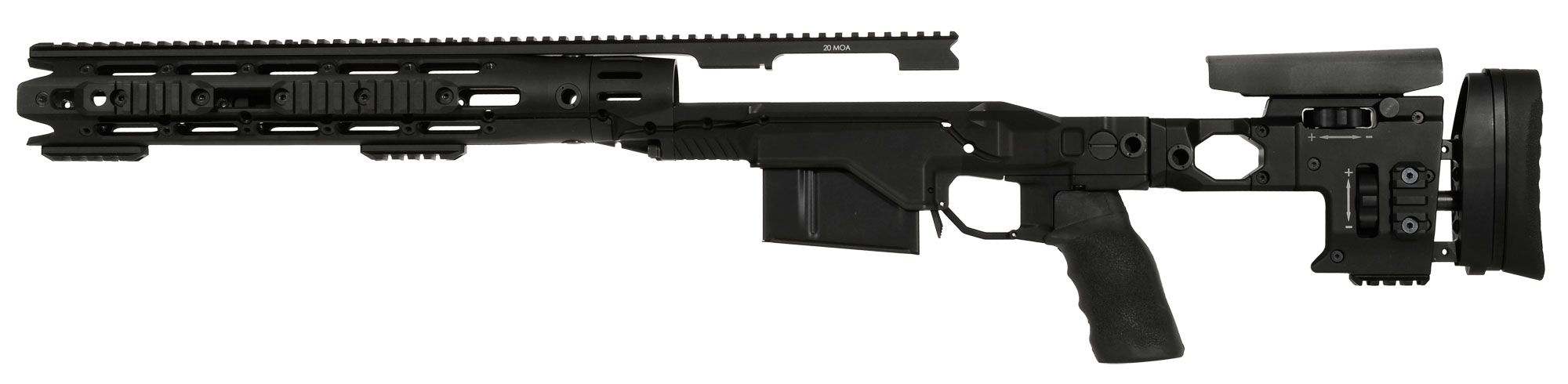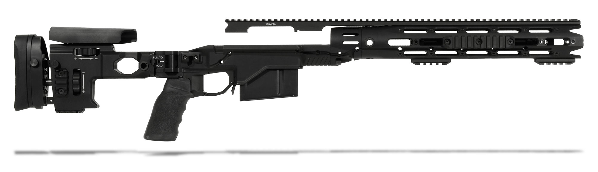 This Remington Accessory Chassis System (RACS) features a long action magazine and a black folding RACS stock. The operator friendly RACS also features a free-float tubular design, fully featured front handguard, the ability to attach auxiliary rail sections to any of the seven remaining facets.