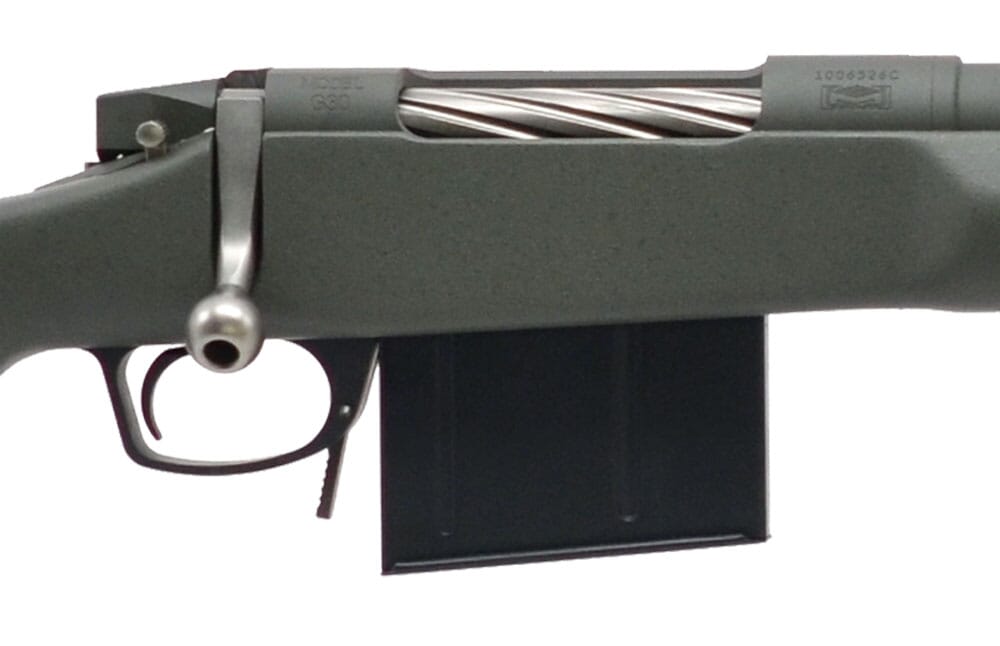 This McMillan G30 TAC-338 .338 Lapua Mag rifle features an olive drab green finish with duracoat coating, match grade 26.5" barrel with muzzle brake, detachable box magazine, square-surfaced recoil lugs, and a McMillan A-5 tactical stock with spacer system, integral adjustable cheekpiece, and flush mount swivel cups.