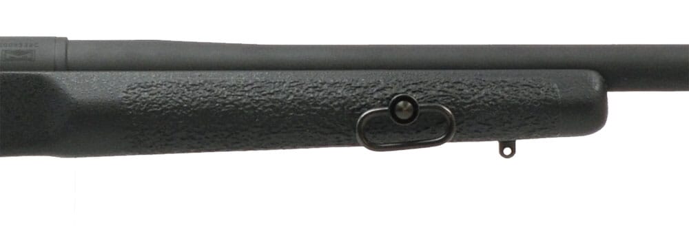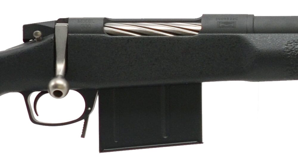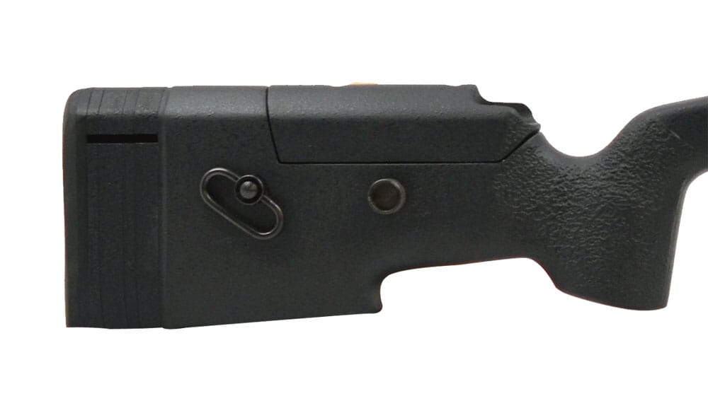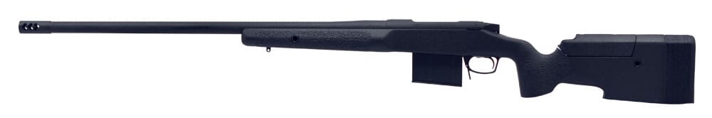This McMillan G30 TAC-338 .338 Lapua Mag rifle features a black finish with duracoat coating, match grade 26.5" barrel with muzzle brake, detachable box magazine, square-surfaced recoil lugs, and a McMillan A-5 tactical stock with spacer system, integral adjustable cheekpiece, and flush mount swivel cups.
