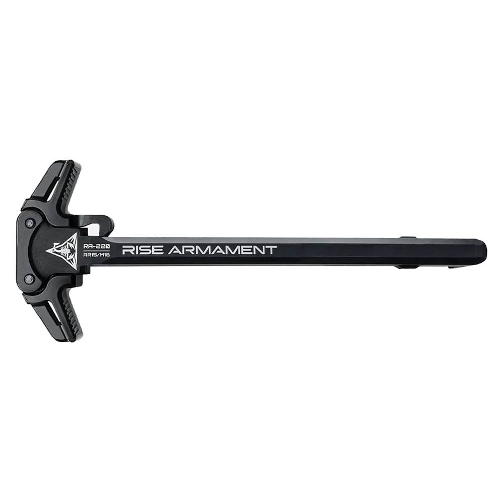 The RISE Armament RA-220-BLK Ambidextrous Charging Handle is a precision-machined upgrade for AR-15 platforms, built from rugged 7075 aluminum with a corrosion-resistant black anodized finish. Designed for both left- and right-handed shooters, it features extended, anti-slip latches for confident operation in any condition. Weighing just 2 ounces and measuring approximately 11 inches long, this lightweight component improves weapon handling without adding bulk. Compatible with standard AR-15 uppers, it installs easily and comes ready to use out of the box—ideal for tactical, competitive, or recreational shooting.