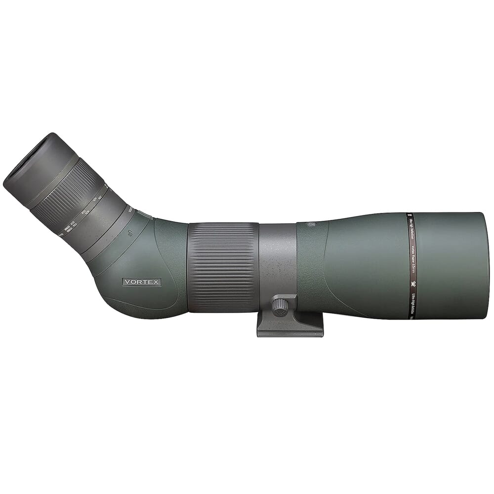 The Vortex Razor HD 22-48x65 angled spotting scope is the premier spotting scope offered by Vortex. It features high density glass for the clearest possible images, XR plus multi-coated lenses for optimal light transmission, Armortek for scratch, oil and dirt resistance, focus ring that surrounds the outer body of the scope, rubber armored body for extreme durability, and a built in sun shade that pulls out to reduce glare. As with all Vortex products, this scope is covered by the VIP warrantee which extends for the life of the product and is transferable.