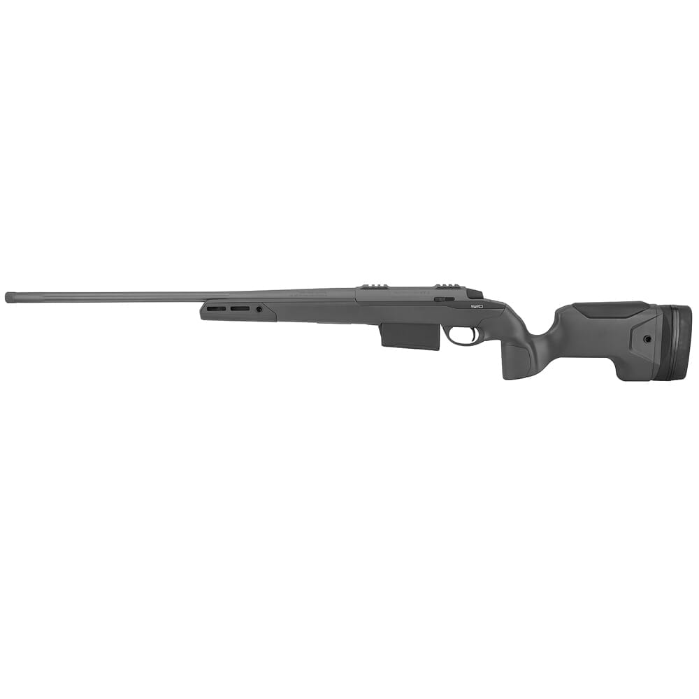 The Sako S20's stainless steel action is brand new and features a 3-lug, push feed bolt with plunger ejection to maximized reliability. The Cerakoted receiver of the S20 features a machined Picatinny rail that allows for the easy mounting of riflescopes. The trigger of the S20 is adjustable for pull weight and for position within the trigger guard (± 7mm) to ensure an absolute perfect length of pull for the shooter. The barrel of the S20 is made from stainless steel and fluted to reduce weight and barrel cool down time. The muzzle of the rifle is 5/8x24 threaded, allowing for the addition of muzzle devices like suppressors or brakes.