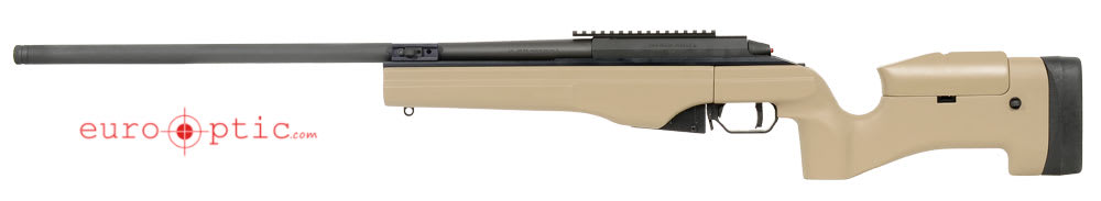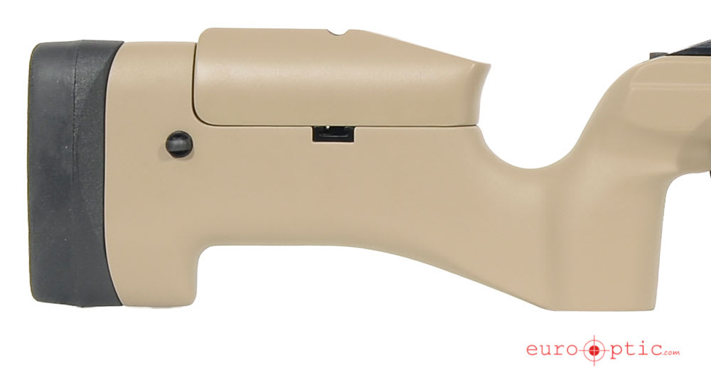 The solid vault-like action is cold hammer-forged from special steel alloy. Integral 17 mm axial scope mounting rails with integral recoil stop-slots on the top of the receiver. The sturdy bolt with three locking lugs feeds rounds unfailingly from the centerline of a detachable staggered 2-row magazine. Reliable feed with various ammunition types. Bolt lift is only 60° for fast bolt throw.
