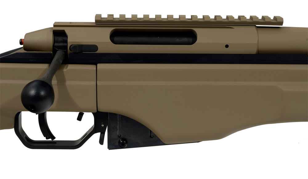 The solid vault-like action is cold hammer-forged from special steel alloy. Integral 17 mm axial scope mounting rails with integral recoil stop-slots on the top of the receiver. The sturdy bolt with three locking lugs feeds rounds unfailingly from the centerline of a detachable staggered 2-row magazine. Reliable feed with various ammunition types. Bolt lift is only 60° for fast bolt throw.