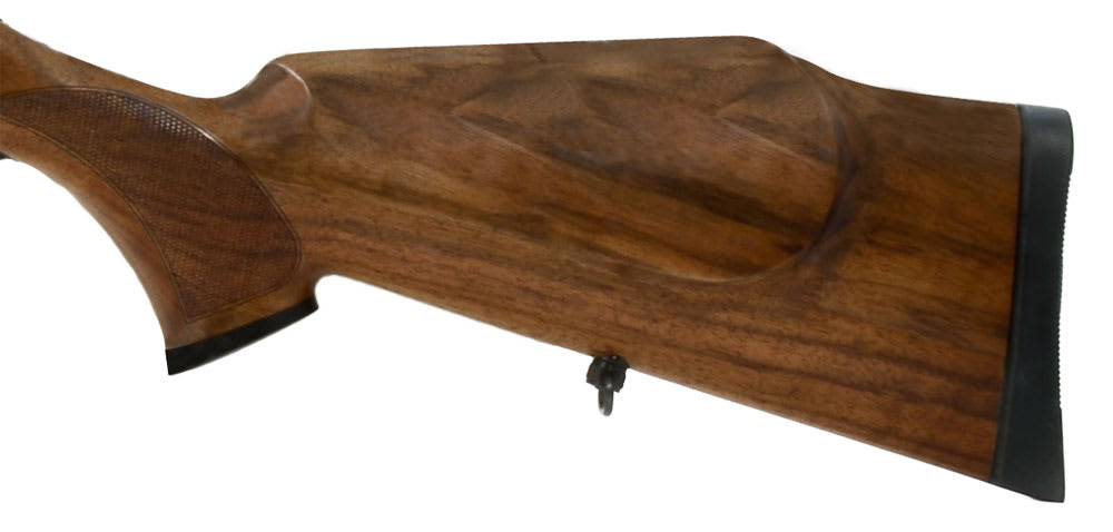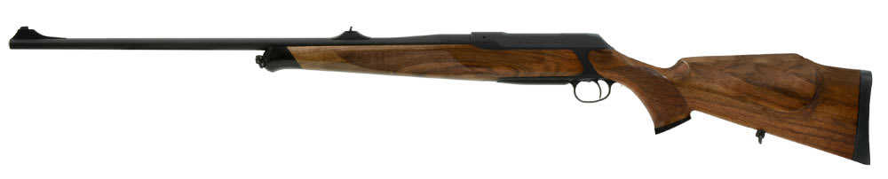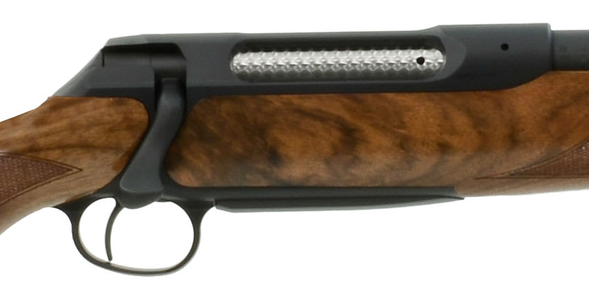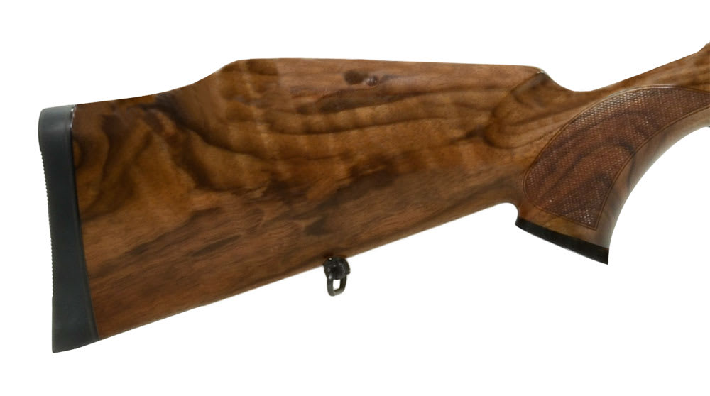 This Sauer 202 Elegance .375 H&H rifle features llaflon-coated steel parts, category 4 wood Monte-Carlo stock with cheek piece, luxury wood fore-end and pistol grip cap, jeweled bolt, swept-back bolt handle, and detachable magazine with metal base.