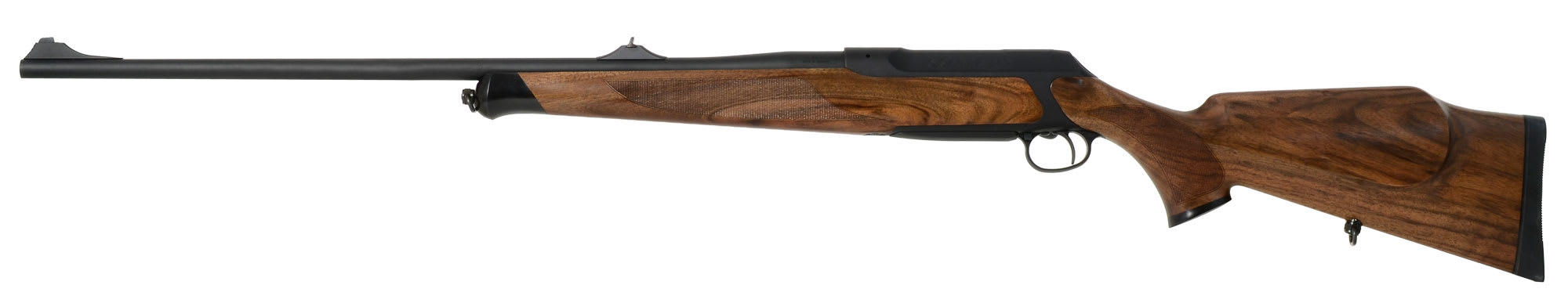This Sauer 202 Elegance Light .270 Weatherby rifle features Ilaflon-coated steel parts, wood grade 4 monte-carlo stock with cheekpiece, luxury wood forend and pistol grip cap, jewelled bolt, swept back bolt handle, and detachable magazine with metal base.