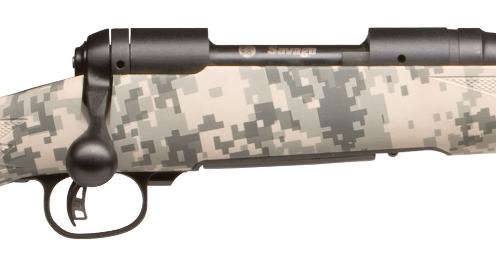 This Savage Arms .308 Winchester is part of the Law Enforcement series and features a camo stock, threaded barrel, detachable box magazine, carbon steel barrel, and is drilled and tapped for scope mounts.