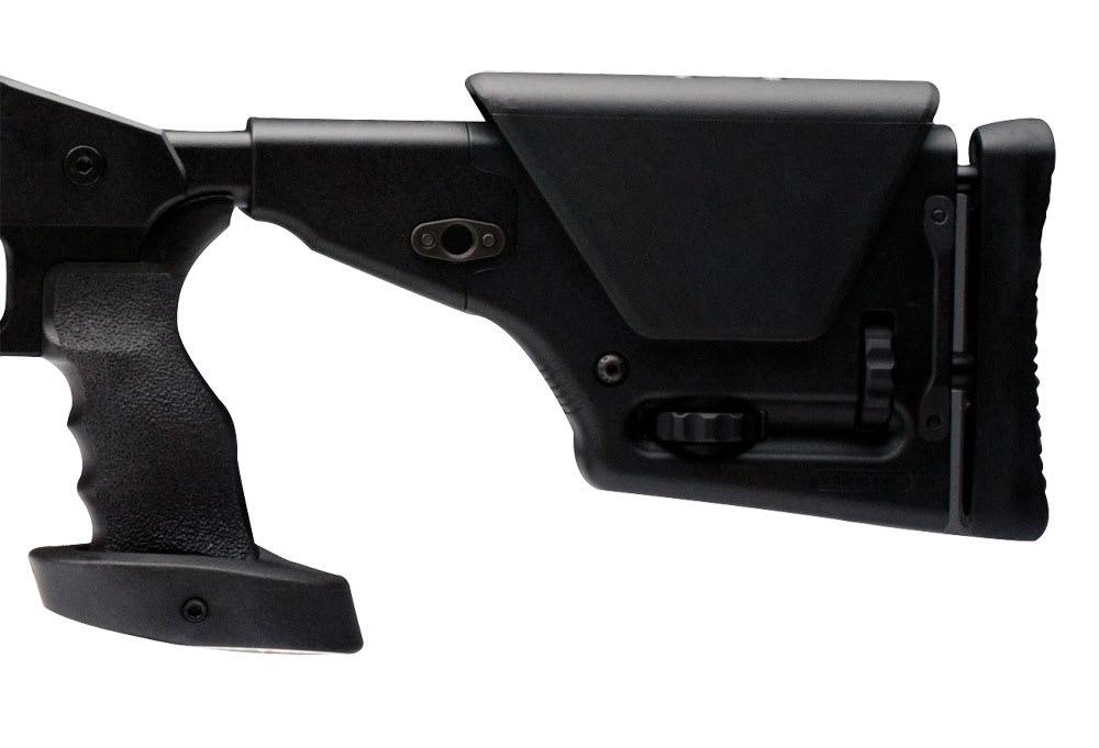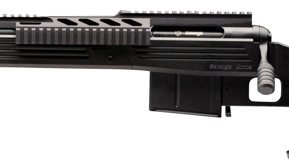This Savage Arms 110 BA .338 Lapua left-hand rifle is part of the law enforcement series and features a detachable box magazine, 20 MOA scope rail, and a carbon steel barrel.