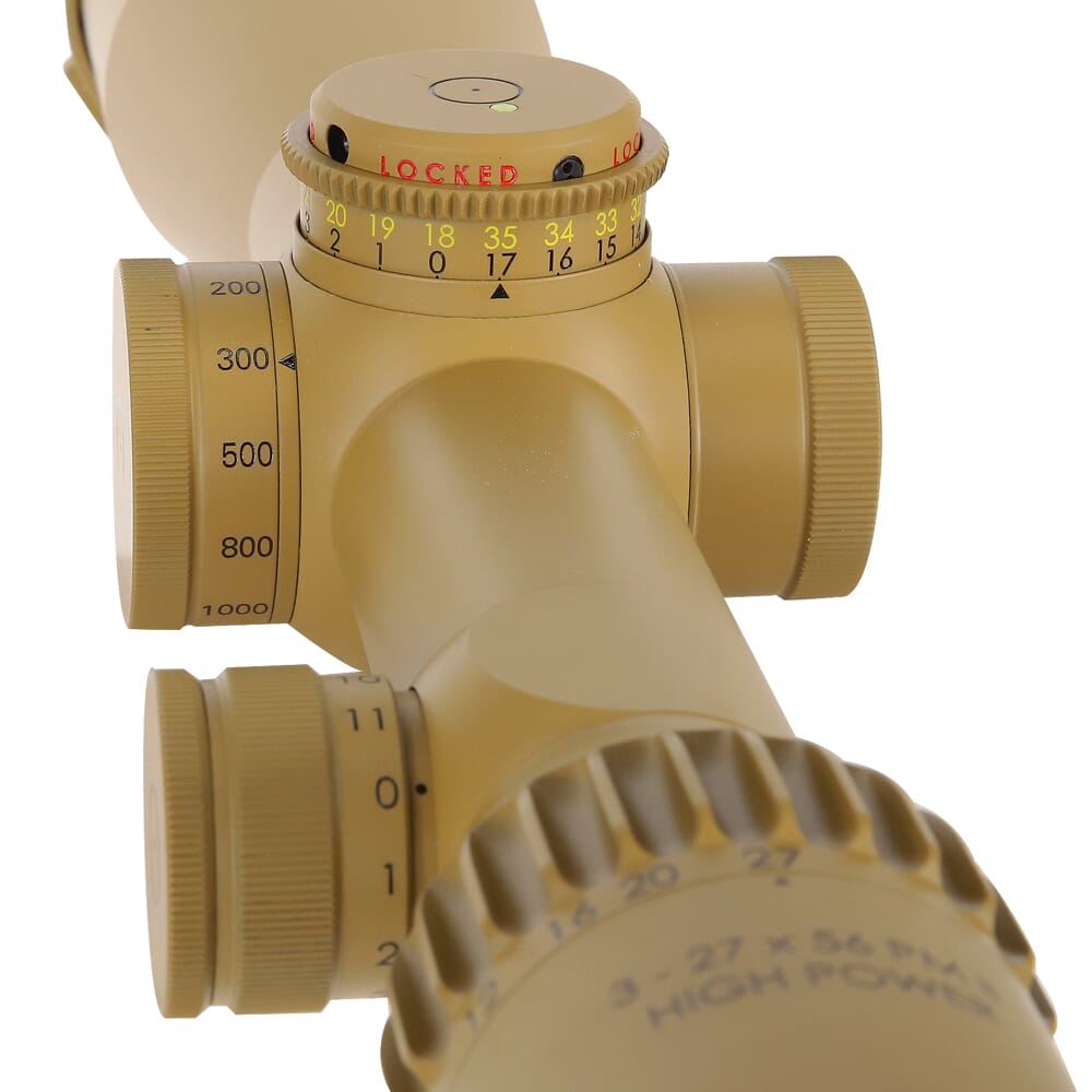 The 3-27x56 PM II line features some of Schmidt Benders most advanced elevation and windage turret options. Like the Gen II Double Turn II+ with tactile turn indicator, MTC or ZC and Locking Turret, that features a lower profile allowing for the mounting of a reflex sight above the scope. On the other end of the spectrum, the Multi Turn II with tactile and visible revolution indicator, MTC and locking Turret option that provides a more precise .05 mrad (or 1/8 MOA) adjustments while displaying markings for 5 full revolutions.