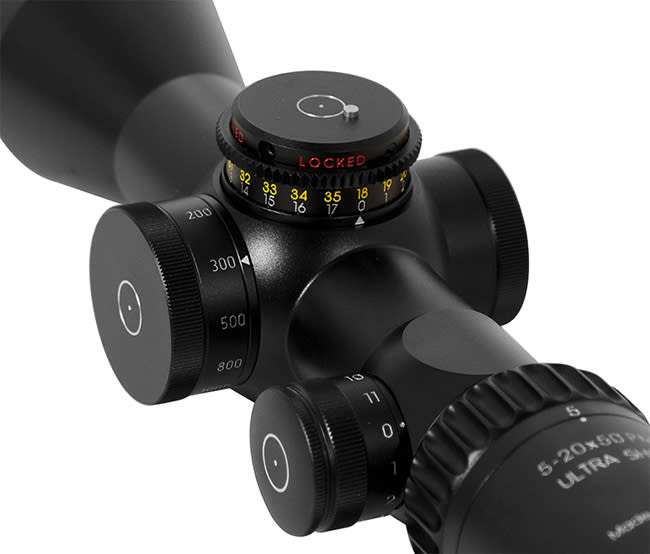To keep the riflescope as compact as possible, all Schmidt Bender 5-20x50 PMII Ultra Short Riflescopes feature low profile elevation and windage turrets, allowing for the mounting of reflex sights for close range engagements. All Schmidt Bender 5-20x50 PMII Ultra Short scopes come with locking turrets and ZeroClick to ensure the scopes zero is never unintentionally reset or lost. Some elevation turret options for the 5-20x50 PMII Ultra Short also feature Schmidt Bender’s MTC (More Tactile Clicks) technology, allowing for faster and more intuitive adjustments to elevation when engaging targets are varying distances.