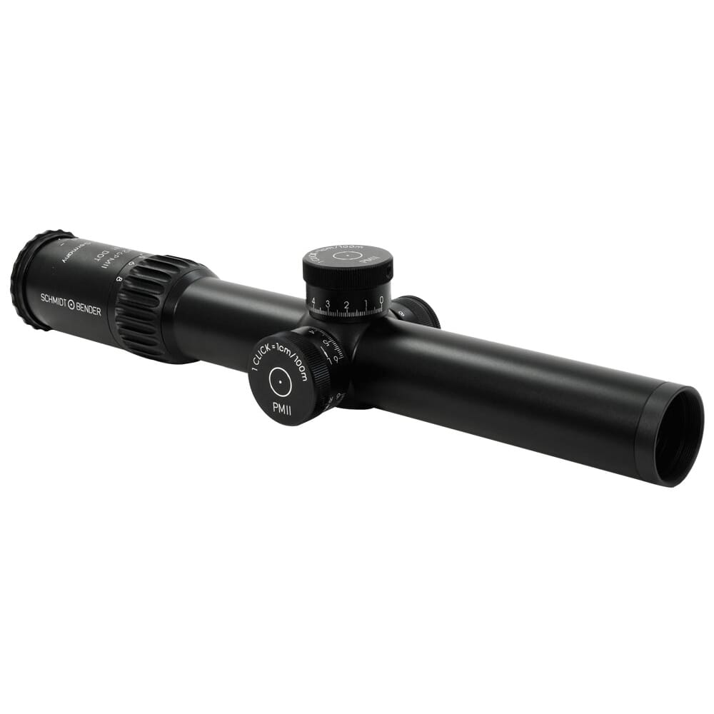 The Schmidt & Bender PM II 1.5-8x26 riflescope with Short Dot CQB Reticle features a 5x zoom, .1 MRAD, ultra bright FlashDot, 90% transmission, and 11 settings from night vision to daylight illumination.