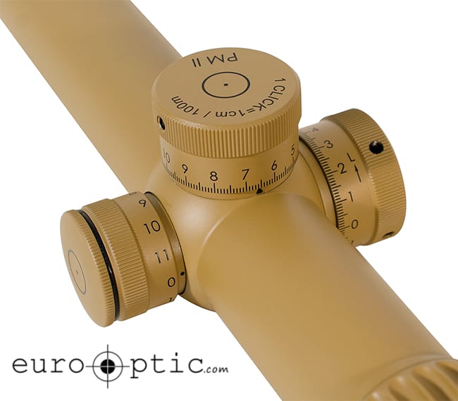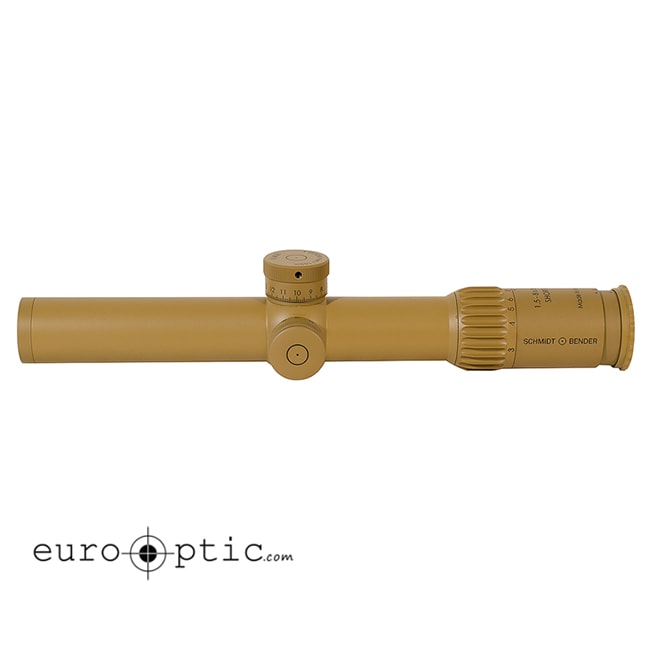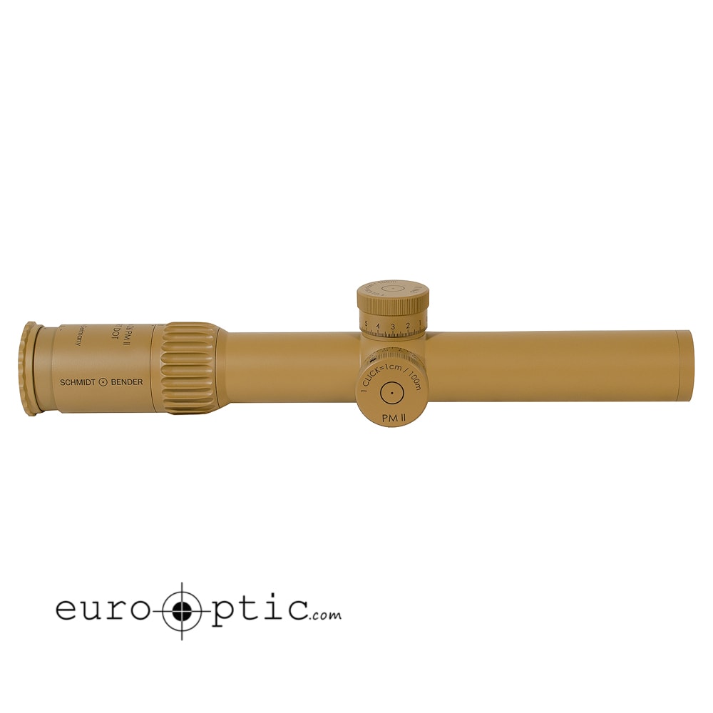 The Schmidt & Bender PM II 1.5-8x26 riflescope with Short Dot CQB Reticle features a 5x zoom, RAL8000 finish, .1 MRAD, ultra bright FlashDot, 90% transmission, and 11 settings from night vision to daylight illumination.